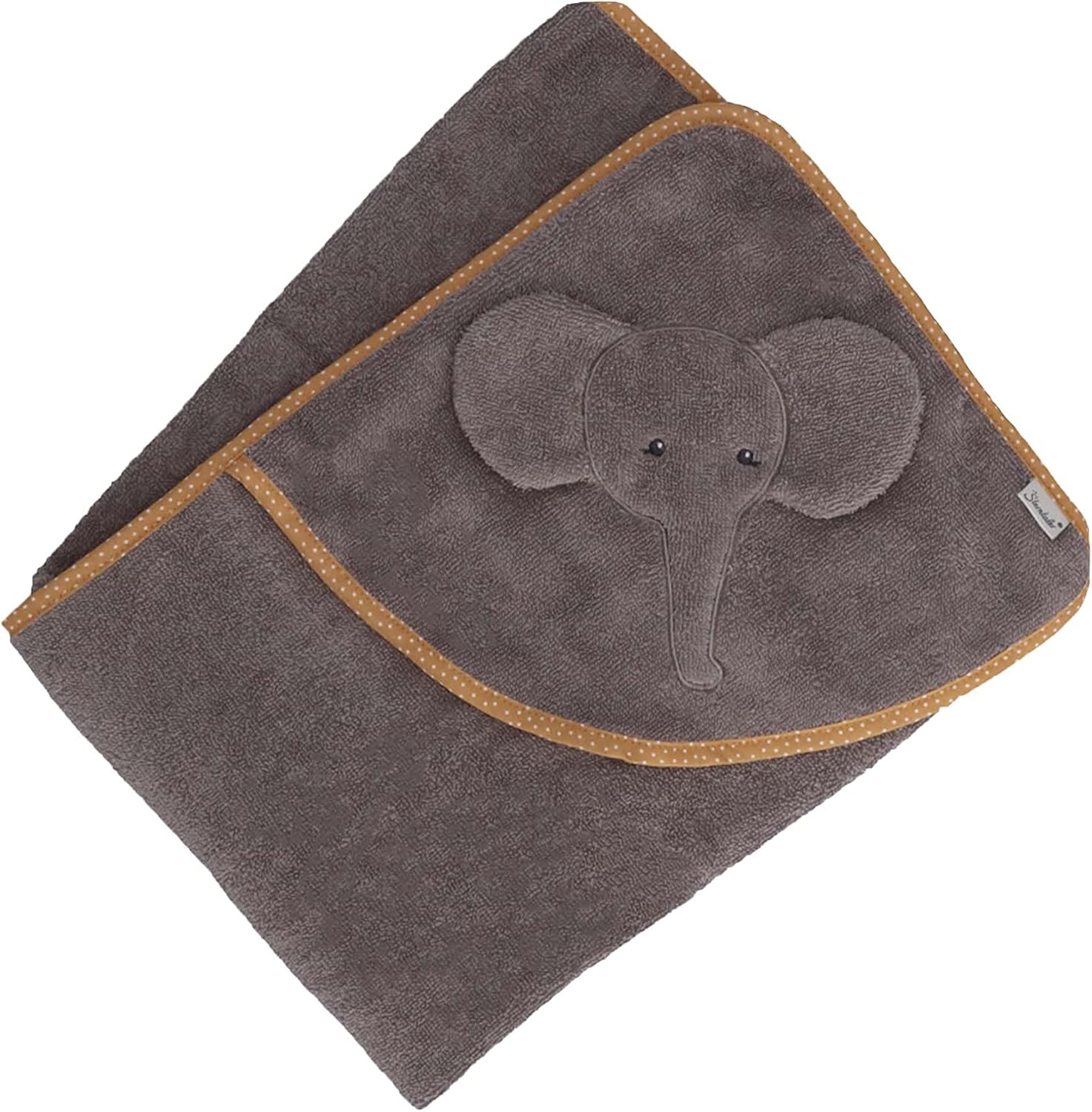 Soft terry (organic) hooded bath towel with Eddy elephant applique protects wet head from drafts