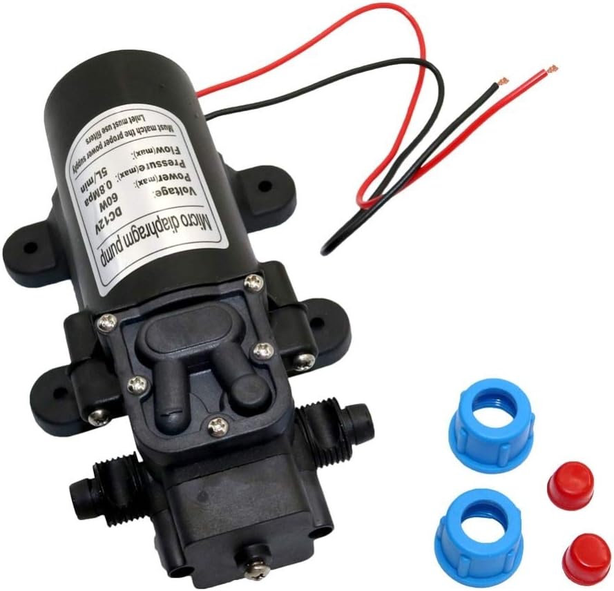 It can provide perfect water flow for watering plants, flower beds, lawns, vegetables and washing cars or cleaning pets.This is a high quality DC micro diaphragm pump, widely used in general industry equipment, medical equipment, chemical equipment, farming (lawn and garden), tour vehicles, special vehicle, ship, beverage, vehicle cleaning, carpet cleaning, ground cleaning, water purification and water treatment equipment. Chemical pump, metering pump, air conditioning pump, flow pump, hydraulic test pump, sewage pump, booster pump. Features: Name:DC 12V 60W Micro diaphragm PumpVoltage: 12V Power: 60W Intake Pressure: 0.2Mpa Rated Pressure: 0.8Mpa Flow (MAX):5L/min Protective Valve Type:intelligent valve (with Pressure switch)Note: Must match the proper power supply ,lnlet must use filtersSpecifications of the adapterInput:AC100-240V,50/60HzOutput:12V-6APackage: 1 Pc 18mm Pumpor 1 Pc 1/2 " Pumpor 1 Pc Power adapterFeatures:1. When the water outlet is completely blocked, the motor will not stop, but the return valve will open, and the water will circulate in the pump.2. The mounting feet are rubber instead of rigid plastic, which provides fairly good vibration isolation.3. Built-in pressure switch, it automatically turns on and off as you turn your tap or nozzle on and off. 4. Water inlet and outlet interface connect with silicone PE or PU pipe.FAQIs the pump loud ? Will idling burn if don't connect with water ? The pump has a certain noise during working hours, about 70 decibels. The inlet pipe is made of flexible hose, and the pump is fixedly installed to reduce noise. No water idling for a long time will not damage the pump.Is there water in the pump that has been used? Each pump is tested at the factory, so there will be clean water in the water, so please put a red waterproof cap in time to prev