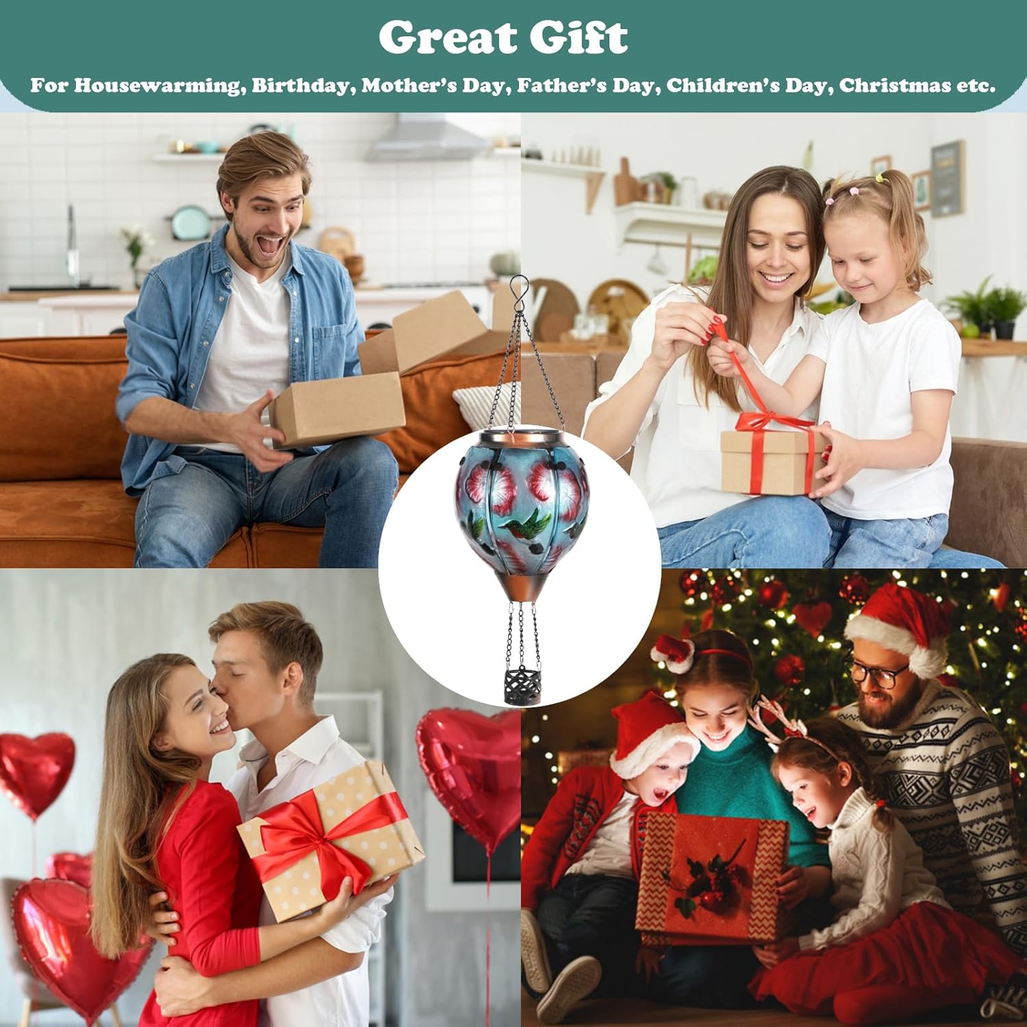 Hot Air Balloon Solar Lantern Flickering Flame Hanging Garden Lights, Glass Outdoor Waterproof Flame Effect Hot Air Balloon Hanging Lantern Gift for Balcony Yard Holiday Party Decorations-Hummingbird