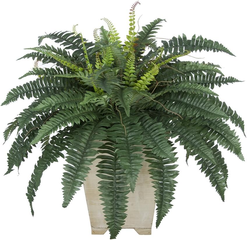 This traditional artificial fern is handcrafted by House of Silk Flowers. This plant will complement any decor, whether in your home or at the office. A professionally-arranged artificial fern plant is securely "potted" in a rustic white-washed wood planter (11" x 11" x 13" tall). It is arranged for 360-degree viewing. The overall dimensions are measured leaf tip to lead tip, bottom of pot to tallest leaf tip: 26" diameter x 25" tall. Measurements are approximate and will be determined by your final shaping of the plant upon unpacking it. No arranging is necessary, only minor shaping, with the way in which we package and ship our products. This item is only recommended for indoor use.
