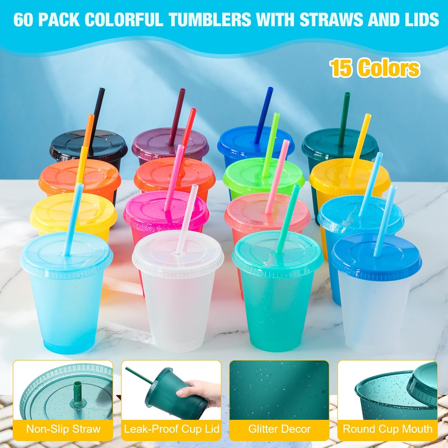 Features: Never lose your straws: Our straws are fitted with a straw bumper to prevent accidental slippage or loss of the straw. The coffee tumbler has a convex base to keep the cup in place. Nice sealing performance: You can secure the lid to the cold drink tumbler with straw with a simple press, preventing leakage and making it easy to travel with. Specifications: Material: PP plastic Color: as shown in the picture Capacity: approx. 16 oz Package includes: 60 x Plastic tumbler with lids and straws Notes: Manual measurement, please allow slight errors on size. The color may exist a slight difference due to different screen displays.