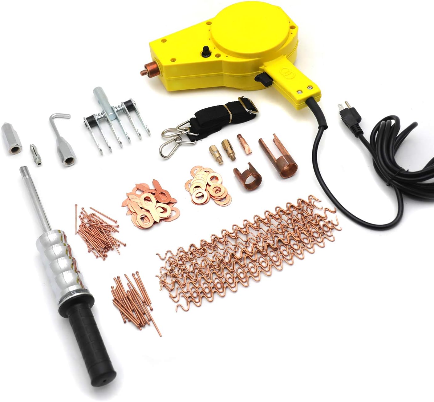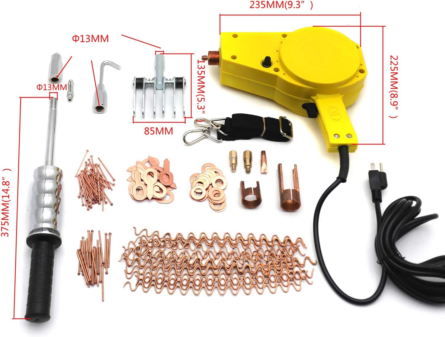800VA Auto Body Stud WelderThe spot welder holds stud in welder Compatiable With easy out of position welding. Welds studs easier and faster. Super sensitive trigger in handle Compatiable With one-handed operation and built in overload protection, you will find it is comfortable to use the welder.Attributes【DURABLE DESIGN】- These are unique, solid quality products that offer world class performance.They are designed Compatiable With instant welding of draw pins, molding rivets and Compatiable With the 'shrinking' of stressed material.【SUPERIOR SAFETY】- The machine thermal protection will work when the main transformer temperature gets to 95ºC. The safety is ensured.【HEAVY DUTY SLIDE HAMMER】- Heavy duty construction with quick release chuck to grip pins firmly without slipping. Cast iron slide weight and comfortable vinyl grip.【COMPACT&PORTABLE】- Super sensitive trigger in handle Compatiable With one-handed operation. Easy to manage D handle design. With a case, it is lightweight hand-held auto body repair stud welder easy to use.【WIDE APPLICATION】- Compatiable With the repairing of metal elastic deformation, plastic deformation, direct damage(breakage, scratch, dents, and rust), as well as some of the indirect damage, targeting at some of the repairing work Compatiable With damage caused by car collision.Specification:Input voltage: 110VInput power: 800VAOutput voltage: 4.5VMax current: 1300AFrequency: 50 HZ