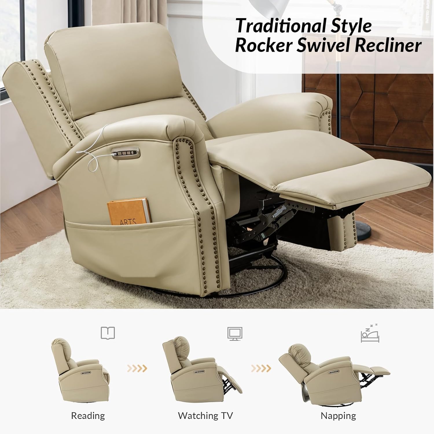 | Additional Features | Metal Base, Nailhead Trims, Power Recliner, Swivel Rocker Recliner, With a Side Pocket |