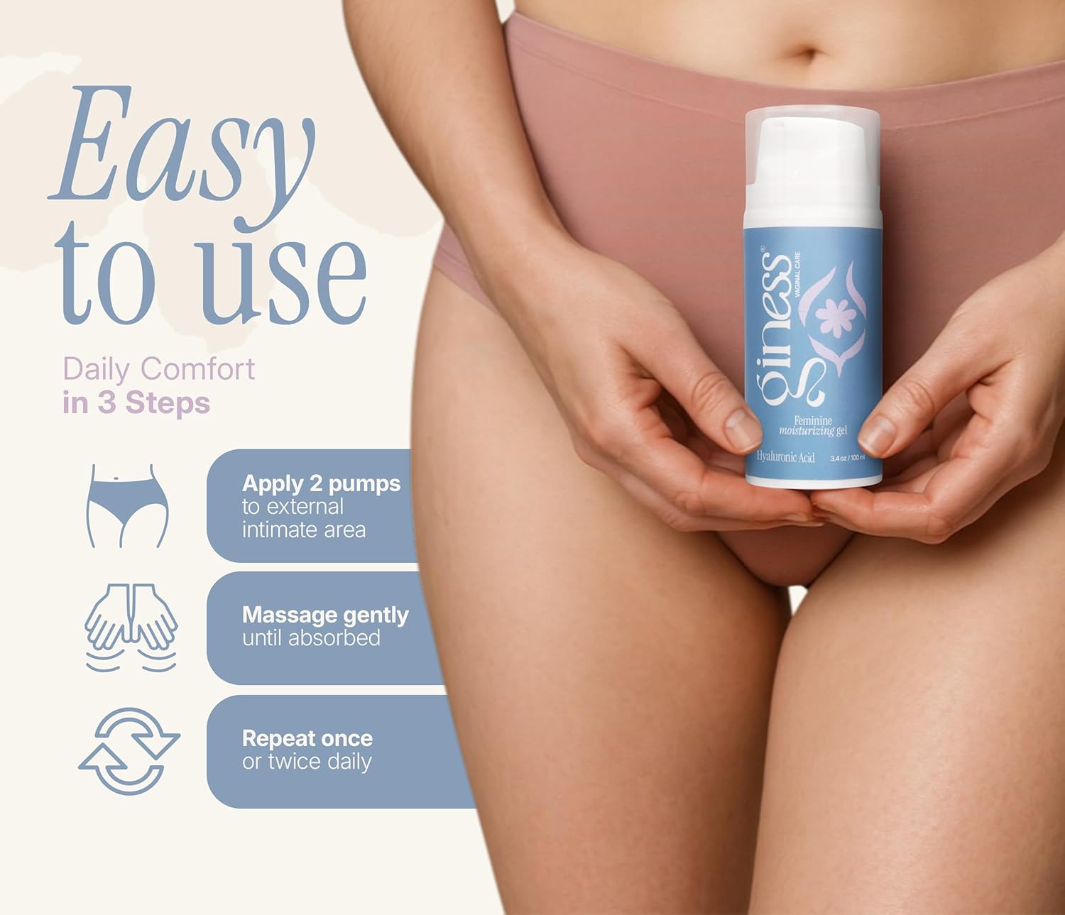 | Product Benefits | Deep hydration for delicate intimate skin Helps retain moisture and improve skin suppleness, leaving the area feeling soft, smooth, and refreshed., Gentle and respectful care Fragrance-free, dye-free, and non-irritating formula ideal for sensitive or mature skin type, Immediate silky-soft sensation Lightweight gel absorbs quickly without stickiness, leaving the skin feeling velvety and comfortable., Improves skin texture and elasticity Supports a visibly smoother, more resilient appearance in mature or sensitive ski, Strengthens the skin’s natural barrier Helps protect against external dryness caused by friction, clothing, or daily hygiene routines., Supports comfort and helps you feel good during intimate times, without being a lubricant. |
