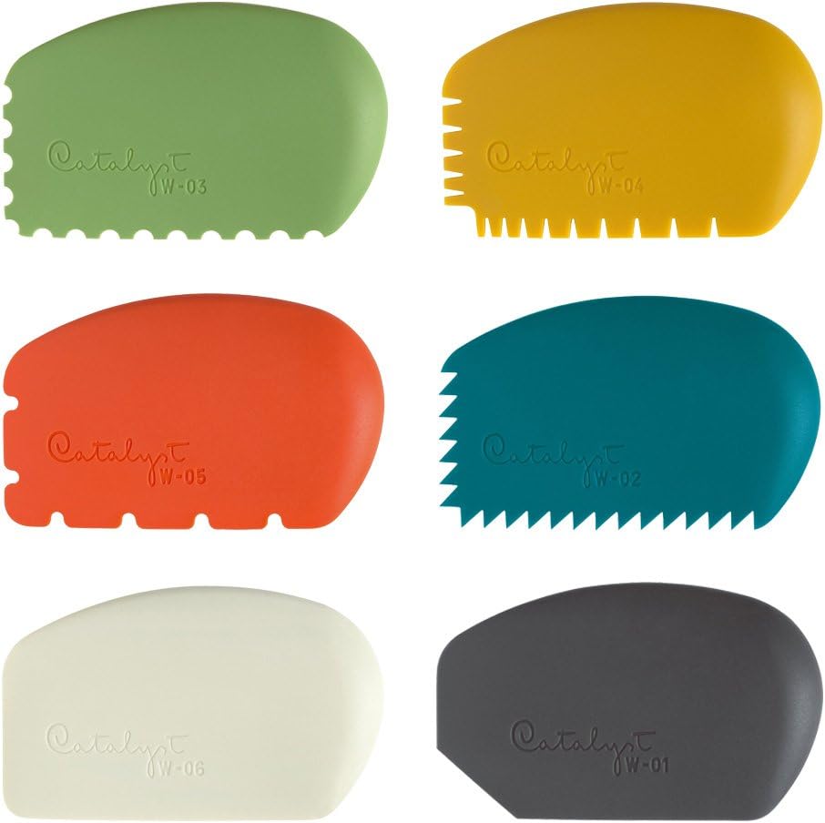 This set of size 15 Catalyst blades by Princeton are crafted from flexible silicon and allow for artistic exploration. Featuring six unique designs, each blade within the set is mounted onto a long brush handle and offers a blend of traditional and creative elements for the artist. Designed for use with heavy-bodied paints, these heat resistant blades also excel with encaustics. Highly versatile, Catalyst have been used by artists with plaster, clay and even food crafting. The solvent resistant blades can be easily wiped clean with mild soap and water.