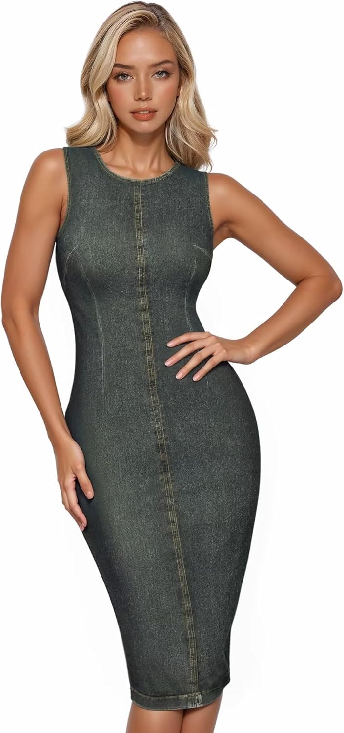 • VERSATILE LOOK:The Women’s Super Stretch Slim Fit Crew Neck Sleeveless Denim Dress is incredibly versatile, offering endless styling options. For a casual look, pair it with sneakers or flat sandals. If you're aiming for a more polished outfit, add a stylish belt, ankle boots, or a blazer. This adaptability makes the dress suitable for everything from weekend outings to semi-formal events, ensuring it remains a key wardrobe piece.