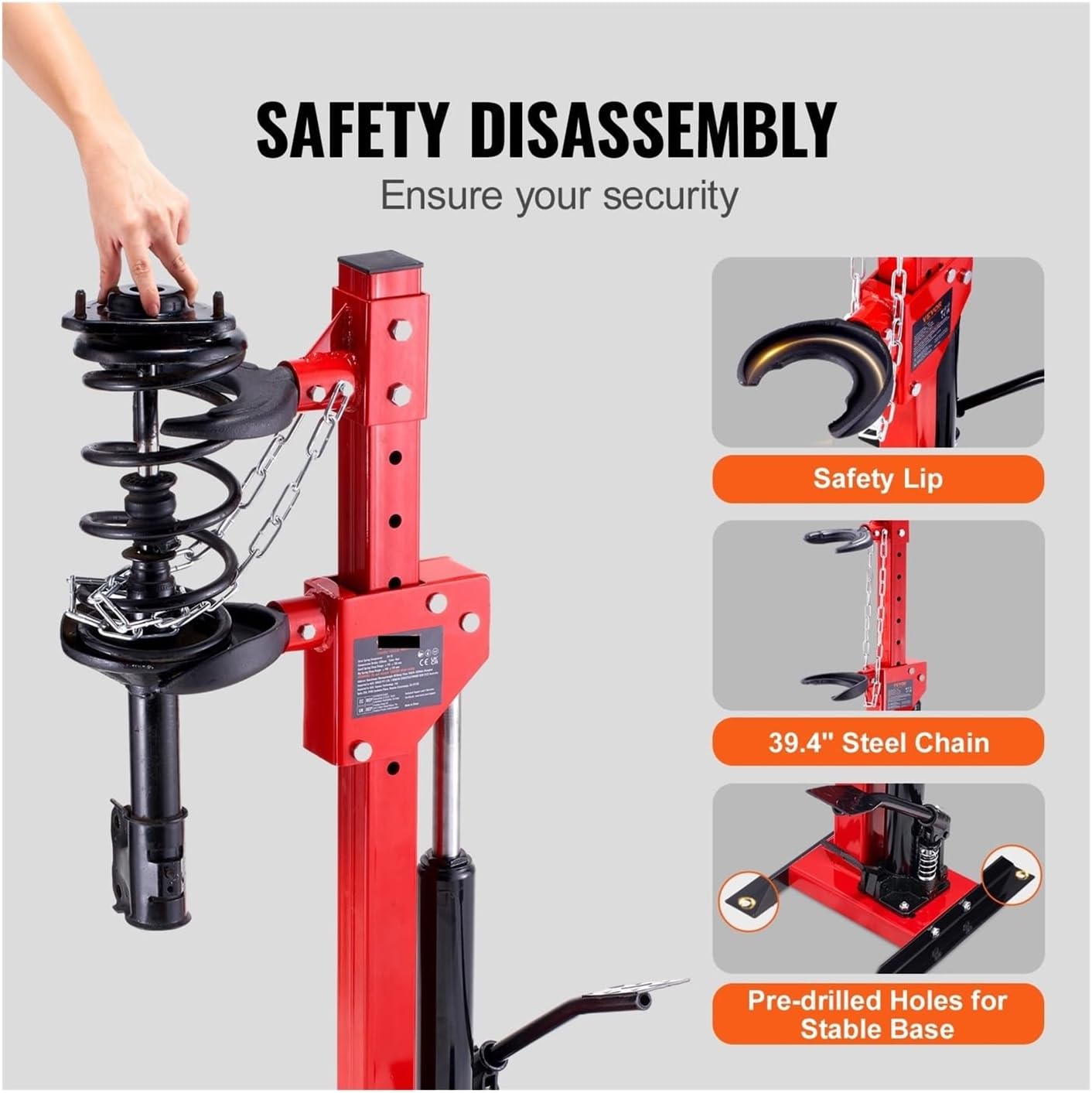 Your Solution for Efficient Spring Compression Work!Upgrade your suspension maintenance game with the power, versatility, and safety of our hydraulic spring compressor. Say goodbye to complications and risks say hello to efficiency and peace of mind.With exceptional load capacity and a wide compressible ran, our coils spring compressor effortlessly dismantles springs from motorcycles, cars, pickups, SUVs, and more. Enjoy the convenience of on-vehicle shock absorber spring removal, simplifying replacements and installations.To maximize safety during spring disassembly and assembly, we've integrated safety tongues, an extended safety chain, and a stable H-shaped base. These features ensure a secure operation, minimizing the risk of wobbling.The heat treatment process increases the hardness and gth of the entire product. High-quality hydraulic jacks and heavy, high-hardness steel protect against dama during long-term use, effectively improving safety.Hydraulic jack adopts strict anti-oil leaka hydraulic pump, long-term use is not easy to oil leaka failure, with damping hydraulic rod smooth lifting, not easy to t stuck, will not produce sudden rise and drop risk.Features & Details45 Ton Hydraulic Load Capacity The hydraulic jack has a 45 ton load capacity and the rated compression force is 1 ton Our coil spring compressor is great for various vehicle types, including sedans, SUVs, off-road vehicles, and pickup trucks. Perfectly suited for spring disassembly and shock absorber maintenance.Versatile Clamping Options: Our spring compressor comes with two clasps for the utmost versatility. The small spring clasp accommodates sizes from 4.3" to 5.1", while the big spring clasp caters to 5.5" to 6.7" sizes. With a maximum compression stroke of 12.6"/320 mm and featuring 8 positioning holes on the column, you can easily adjust the clasp position to match different spring heights.Stable Suspension: Prioritizing safety and convenience, our coil spring compressor features a stable suspension system that prevents bouncing due to spring tension. It halts at the current position and only descends slowly when you enga the pressure release valve.Safety Assurance: The strut spring compressor provides multiple-layered protection: a 39.4" extended safety chain to secure the springs, an additional stable locking mechanism, and a safety tongue on the clasp to prevent spring detachment accidents. The H-shaped stable base ensures minimal wobbling during operation. For added security, two pre-drilled holes allow you to anchor the compressor to the ground.Premium Material Construction: The hydraulic jack boasts a leak-proof hydraulic pump and a dampened hydraulic rod for seamless lifting and lowering. The Q235 reinforced steel column and the ductile cast iron clasps provide unparalleled durability to withstand extreme pressures, ensuring heavy-duty springs without risk of breaka or bending.