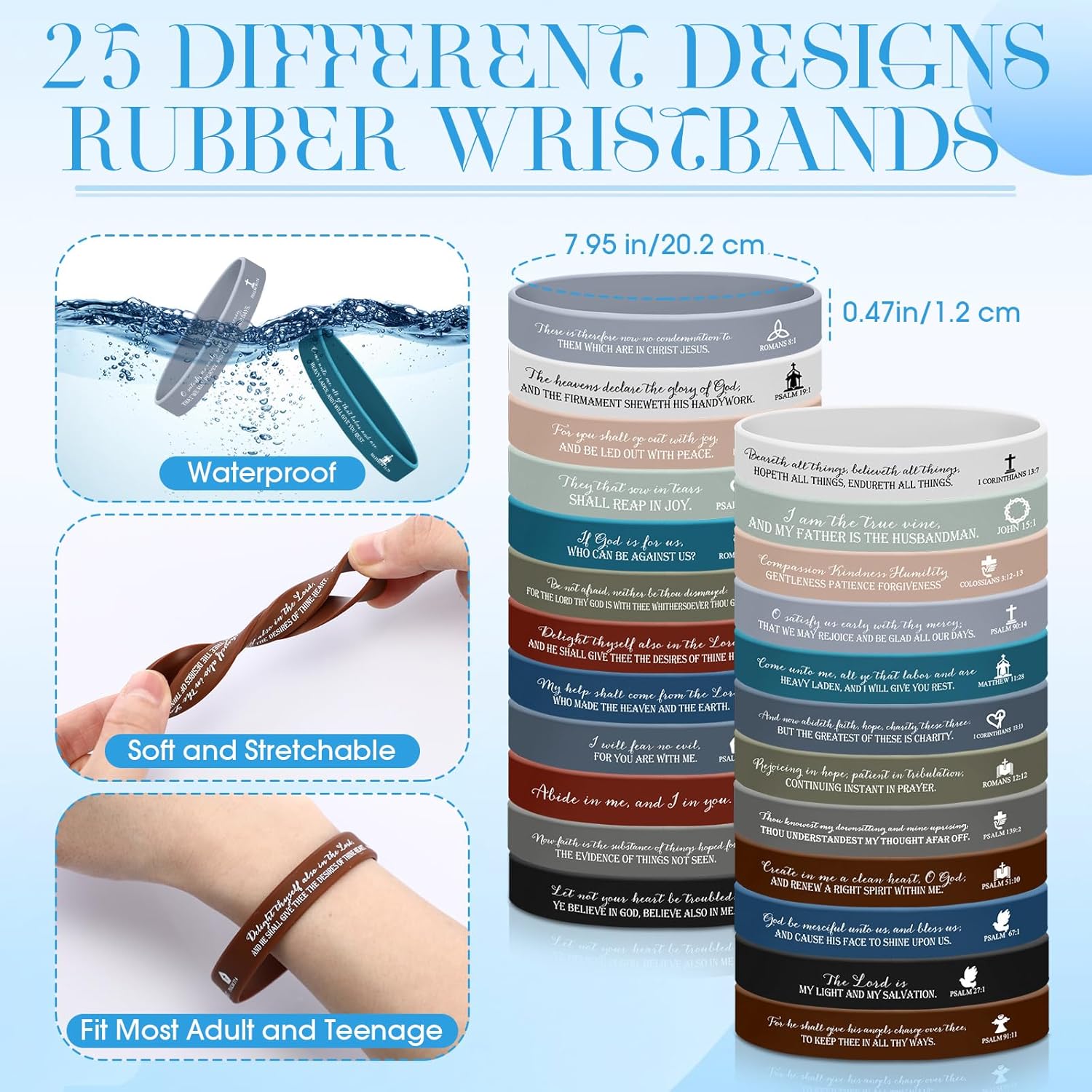 Features: This religious gifts set can also be given as a gift to the church and to the believers as a wonderful reward for them. The large quantity church gift is enough to meet your party needs. You can give it to your friends and relatives. Specifications: Material: Cross card: 300 g double copper paper Bracelet: rubber Bag: opp Color: various colors Size: Cross card: about 3.15 x 4.72 inches/ 8 x 12 cm Bracelet: about 7.95 x 0.47 x 0.08 inches/ 202 x 12 x 2 mm Package includes: 300 x Cross cards 300 x Christian bible bracelets 300 x OPP bags Notes: Manual measurement, please allow slight errors on size. The color may exist a slight difference due to different screen displays.