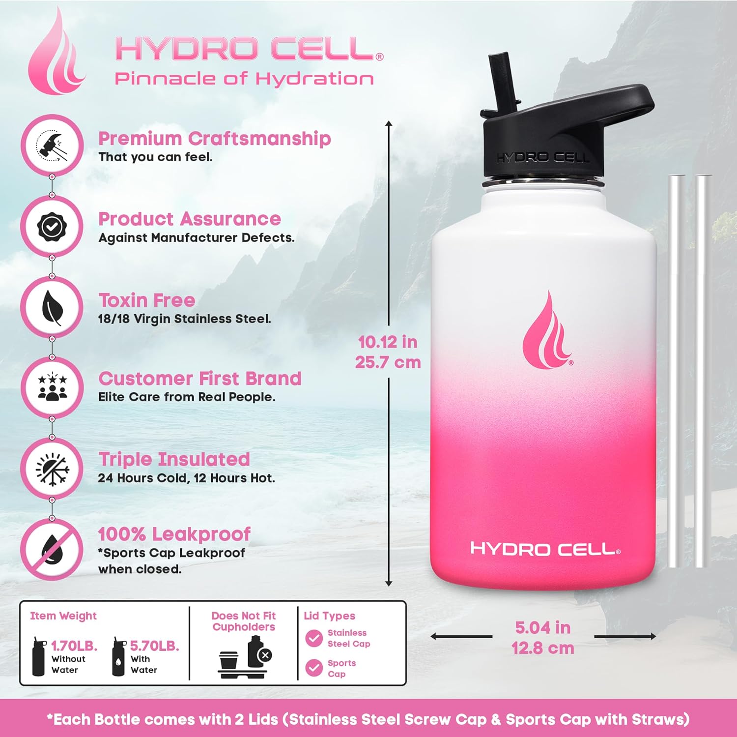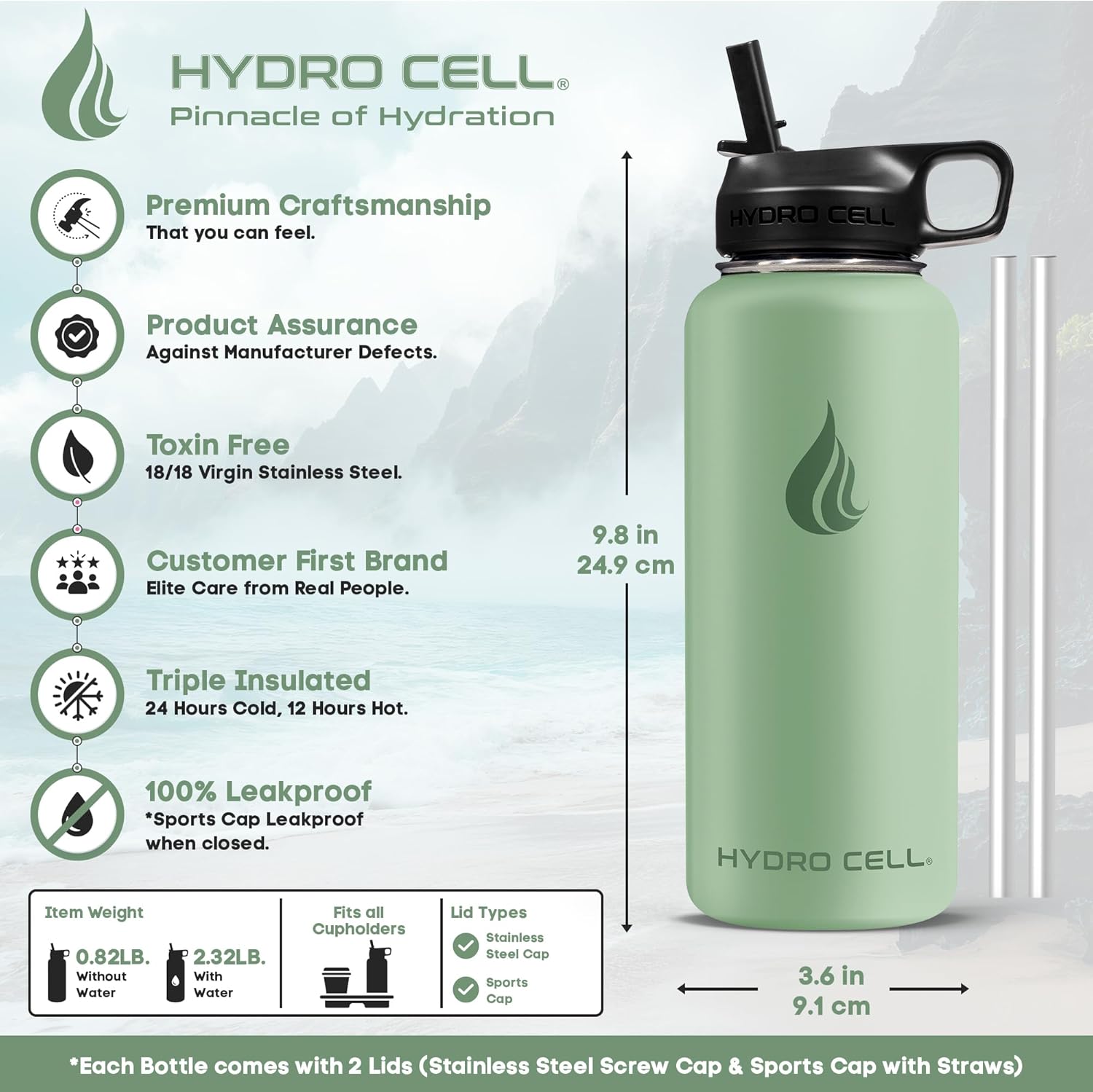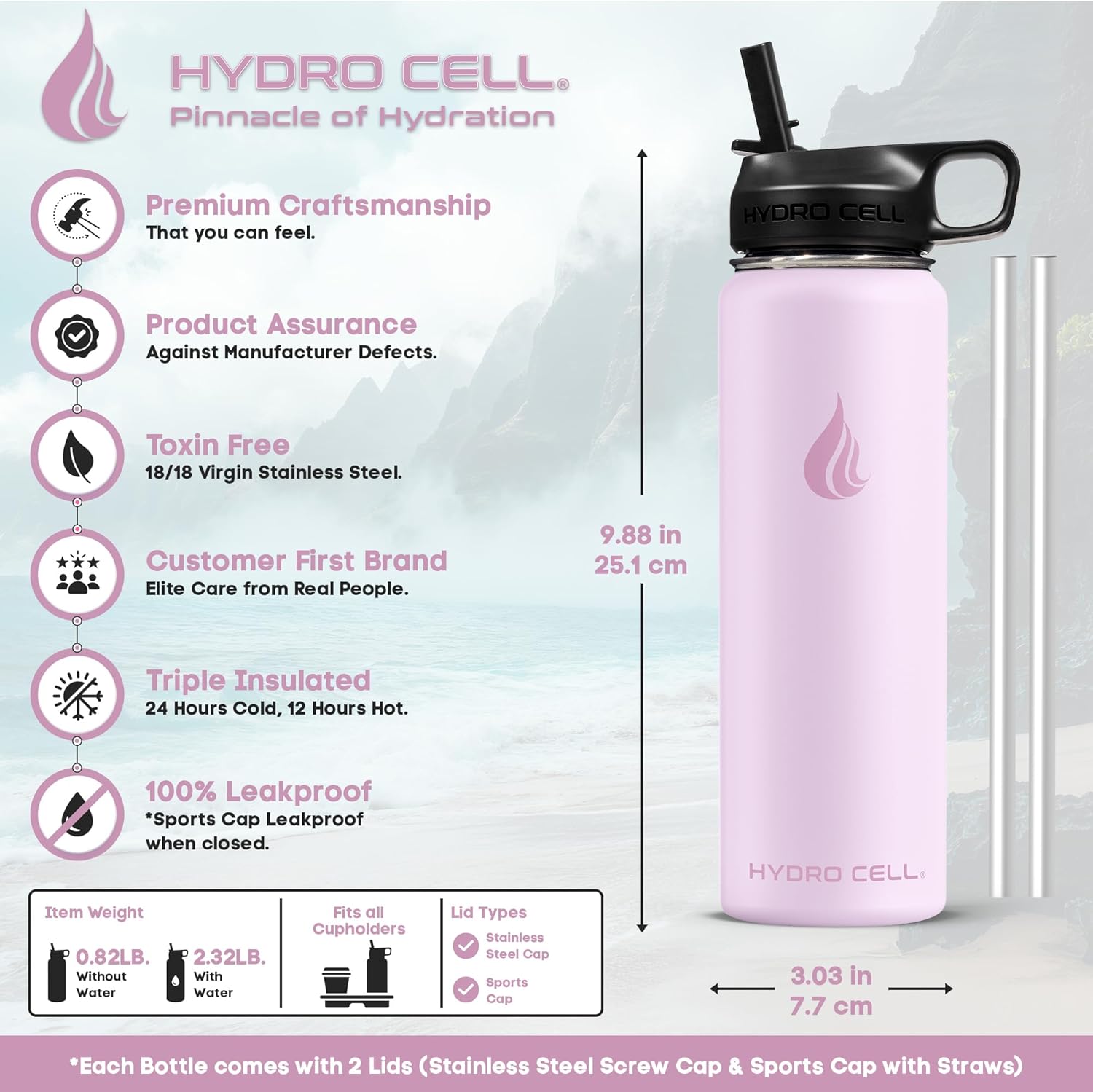 | Included Components | Stainless Steel Bottle, Screw Cap (100% Airtight), Sports Cap with Straws (Cold Temp ONLY), Straw, Wide Mouth Lids |