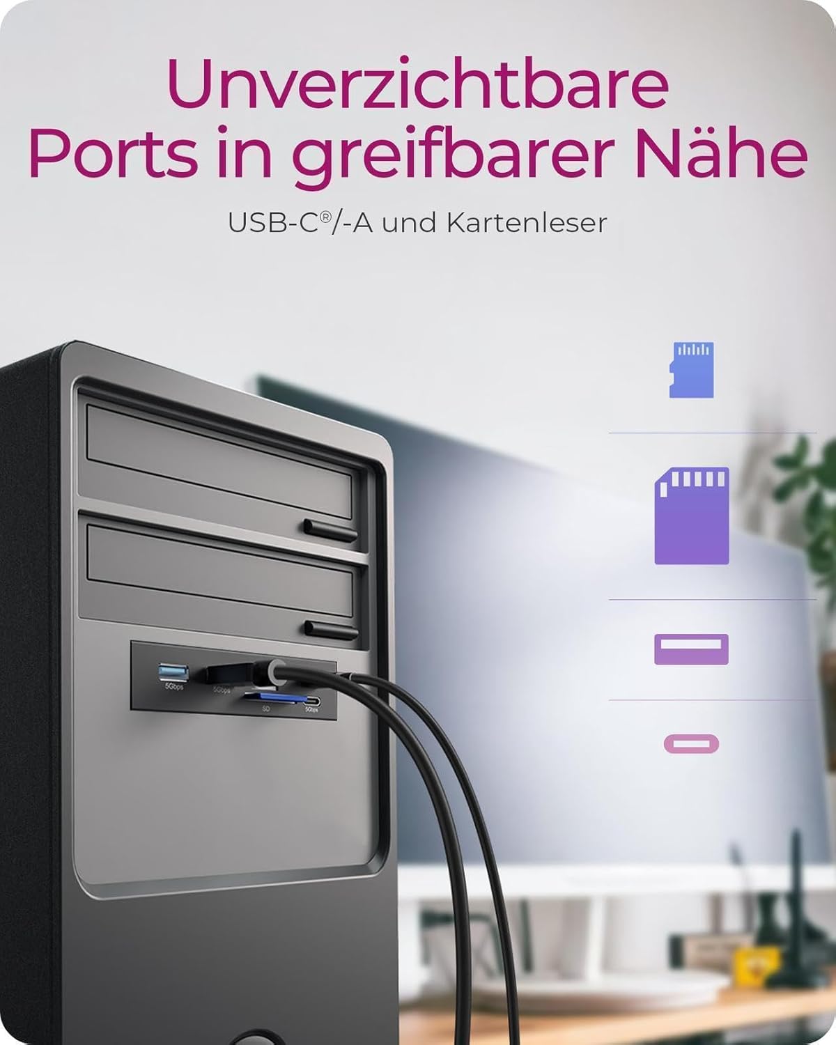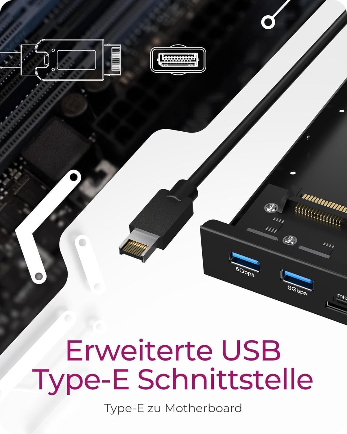 The ICY BOX IB-HUB1419-i3 is a practical front plate adapter for the 3.5" slot, which conveniently brings important ports to the front of the PC. It offers a modern USB-C Type-E interface with up to 20 Gbps, additional 1x USB-C 5 Gbit/s, 2x USB-A 5 Gbit/s and an SD/microSD card reader (UHS-I, up to 104 MB/s). This ensures fast data transfers and convenient access to memory cards at all times. The robust metal housing ensures durability, while the easy integration via USB Type-E and SATA power makes installation easy. Ideal for users who want fast connectivity right at the front of their system.