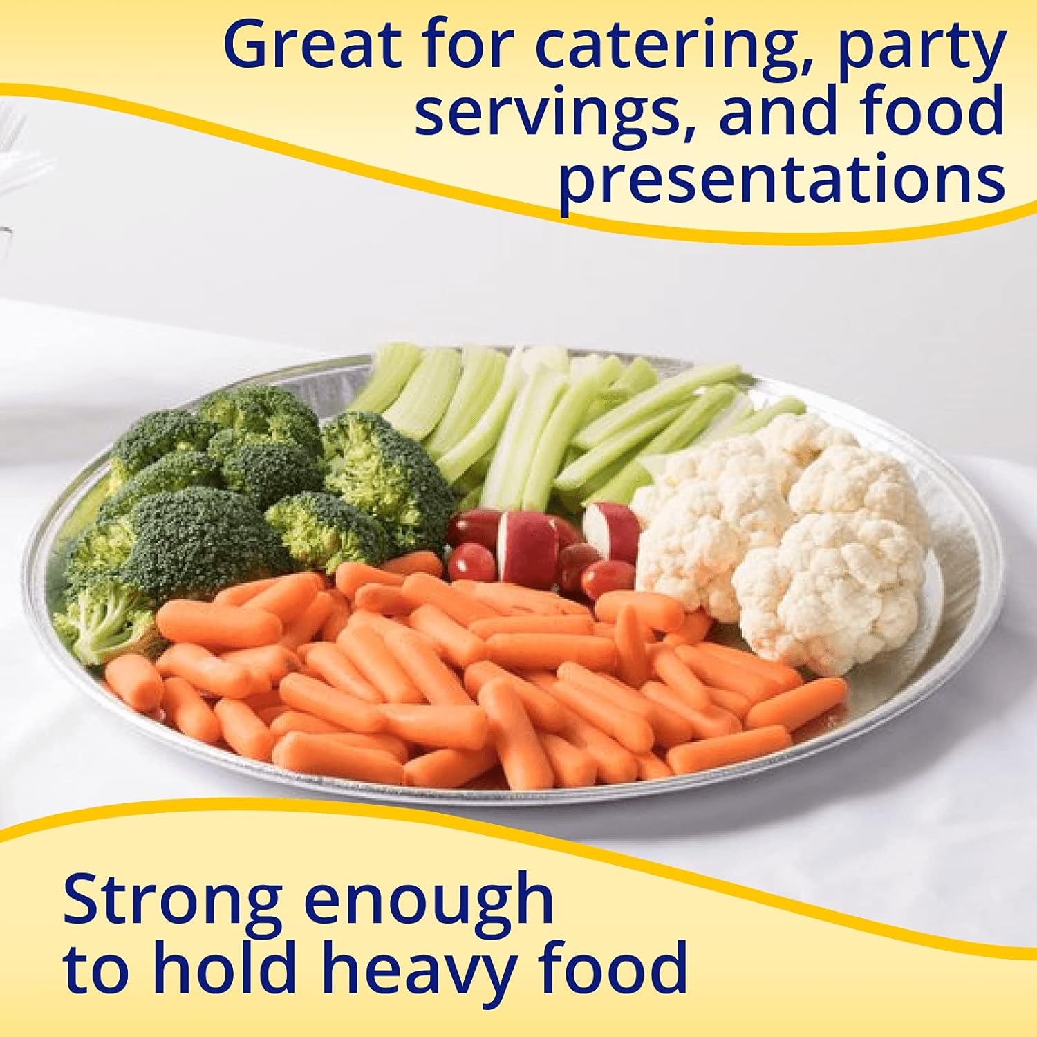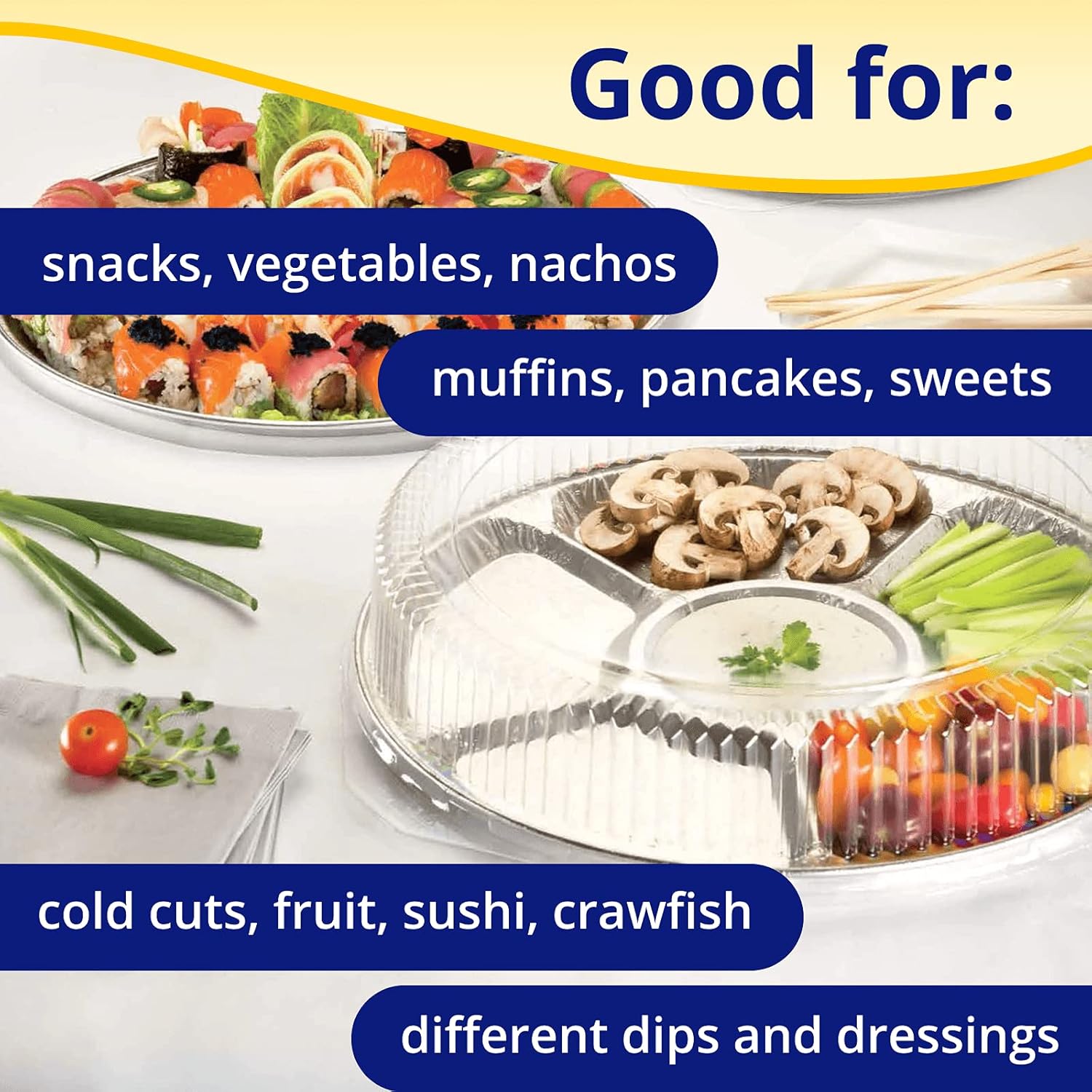 IDL Packaging offers the 12-inch Round Lazy Suzan Aluminum Foil Tray with 6 Compartments and Raised Sides (pack of 10). The foil trays are disposable and 100% recyclable. Also, you can reuse them if you wish. The disposable aluminum tray of silver color is a perfect solution for any food showcase.Our disposable aluminum plates are of high quality, they can hold any type of food. These catering trays can be used by a waiter to serve hors-d'oeuvres or simply left on buffet tables for guests to serve themselves.The aluminum plates for food have dividers and consist of 5 side compartments and one in the center, ideal for your dips. Put savory, sweet, or spicy food on the same tray and the flavors will not mix up. You can be sure your food is always preserved. The lifted edges prevent your food from falling, and these aluminum platters are sturdy enough for you to hold and serve.These lazy susan 12-inch catering platters look much better than plastic trays and will add a touch of glam to any venue you host.The round shapes are perfect for any kinds of desserts, fruit, they are also great for sushi, crawfish, cold cuts, appetizers, and nachos. Be free to use them as catering supplies at weddings, church gatherings, state fairs, or as platters on a buffet table.Visit our IDL Packaging Amazon Brand Store to also find aluminum pans without lids and aluminum foil. Please choose the one that suits your needs best.