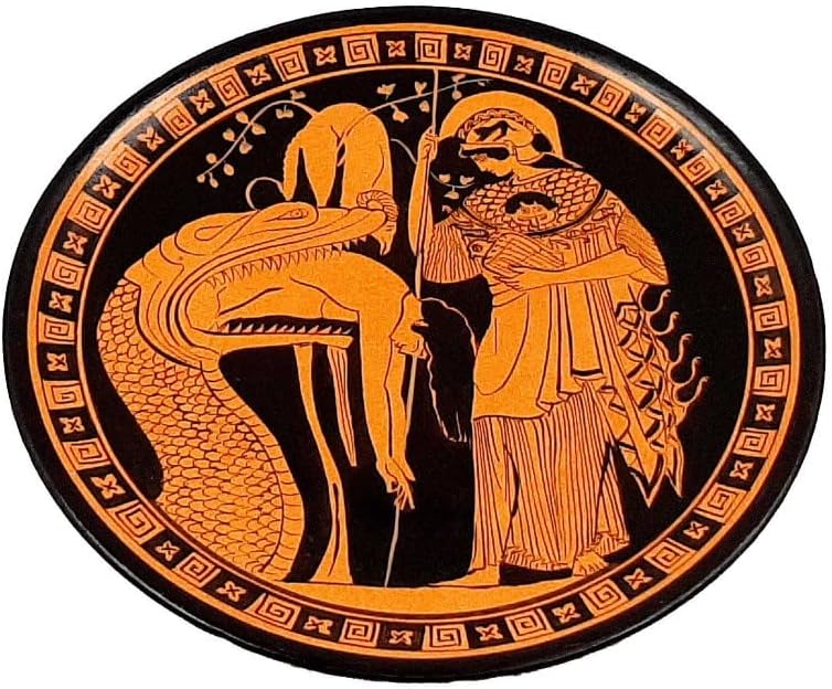 An artisan-made piece, this plate Red figure painted,depecting Jason disgorged by the monster.Jason, the Thessalian hero, son of Aeson, king of Iolcus, arrives in Colchis (the region of Asia Minor between Caucasus and Armenia) at the head of an expedition of noble companions to bring home the Golden Fleece from the divine ram and thus reclaim the throne usurped by Pelias. However the Golden Fleece had been consecrated to Ares by the king Aeëtes, who placed an enormous serpent to guard it. Jason, disgorged by the monster, is saved by Athena: the goddess turns her gaze toward the head of the large serpent which still holds the hero between its fangs, while the Fleece may be seen in the background, hanging from the branch of an oak. Executed in the red-figure technique (late 6th–5th c. BCE), where figures remain the natural red of the clay and details are painted in, allowing greater dynamism and realism. The main scene presents Red Figure Pottery,shows Jason disgorged by the monster and Goddess Athena. Each piece is finished by hand, so minor variations make your item truly one-of-a-kind. Made in Greece by skilled artisans who preserve time-honored methods. Safe package.We use techniques that make the items travel very safely. Don't hesitate to contact us, before or after the order for any question or problem.