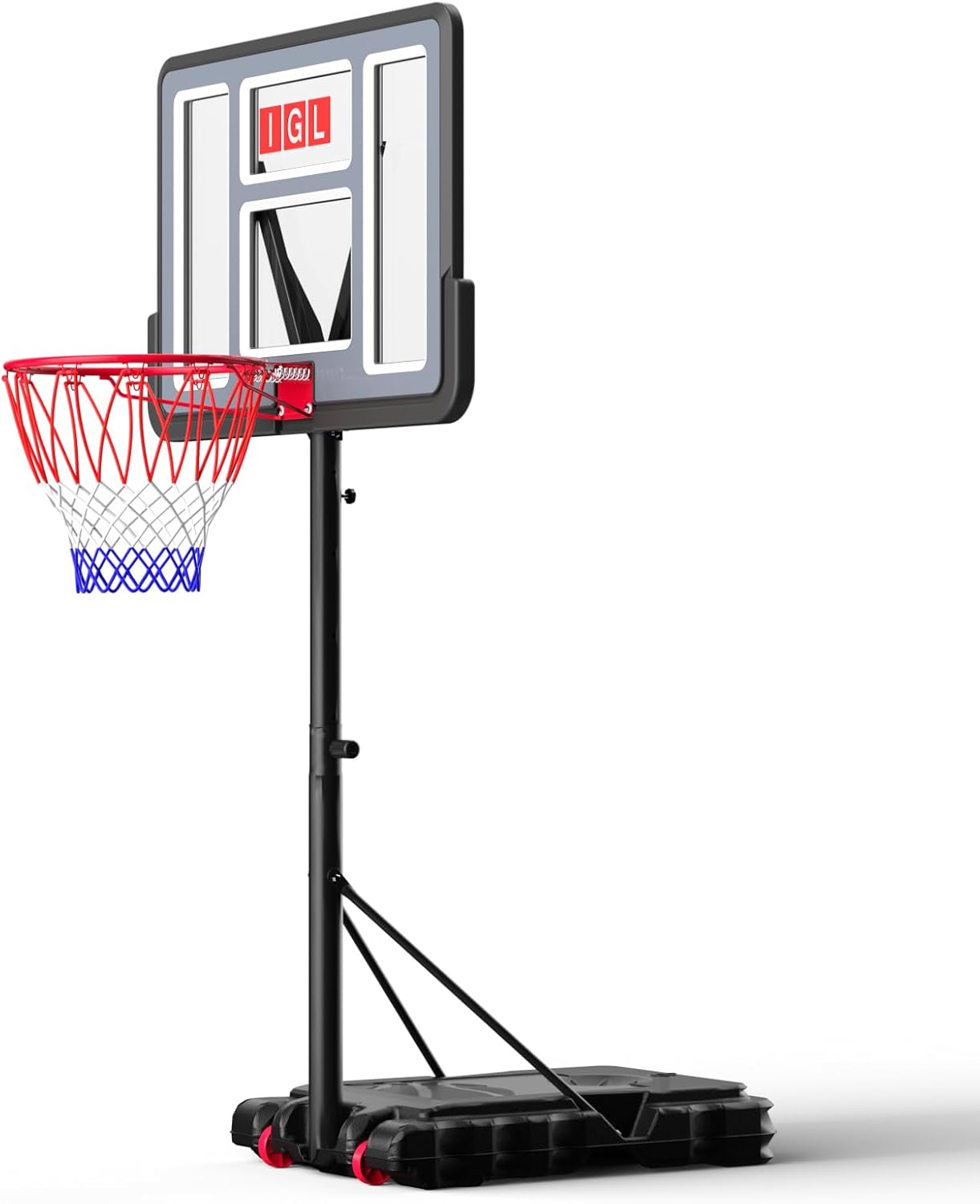 The IGL Adjustable Basketball Hoop offers versatility for players.Its height range is 5.6 to 10 feet (approximately 1.7 meters), making it easily adjustable for children, teenagers, and adults.The height settings are easily switched, allowing for short-range play (5.6-7.6 feet) using three poles and full-height play (8-10 feet) using four poles.The wide base holds 13.2 gallons of water or 143 pounds of sand for stability, and the built-in wheels allow for easy mobility.The 44-inch shatterproof PC backboard and RECC poles ensure reliable performance in different weather conditions. Assembly is simple, with labeled parts, a step-by-step manual, and video instructions.Whether for family fun, daily practice, or competitive competition, this basketball hoop is an good choice.