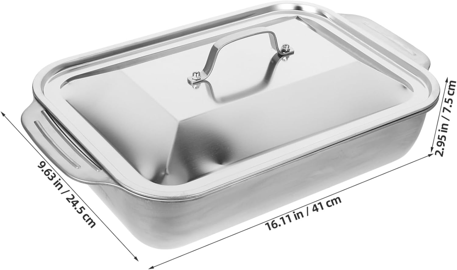 Package Include 1 x lid 1 x roasting pan Features -Material:Stainless steel grill pan -Size:41.00X24.50X7.50cm/16.11X9.63X2.95in(tray) steel pan -Color:Silver hotel pans with lid -Size:35.00X24.50X2.50cm/13.76X9.63X0.98in(lid) seafood pan - Adopting stainless steel material with excellent workmanship, the roasting pan withstands long time using seafood serving pot. - Light weight, easy to take, the stainless steel serving tray is convenient to clean, can be used rest assured stainless tray. - Suitable for using at home, in the restaurant and hotel, the metal serving tray offer you better service rectangular roasting dish. - Practical roasting pan is for storing food, such as fish, shrimp, vegetable and other food metal dinner - With handles on both sides, the metal roasting pan is easy to take, with thickened edges, will not deform or break easily stainless steel plates.Goods Informationroasting trays for cooking This metal roasting pan has rectangular shape, makes it for grilling small lobsters or other seafood.hotel pan This versatile grilling tray is designed for use on both home and commercial grills, to give you more convenience.roasting pan stainless steel Are you looking for fish roasting pan for your home daily use? This metal fish roasting pan can satisfy your using needs