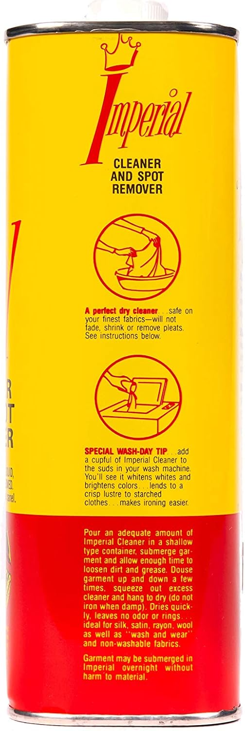 Multi-Use solution for dry cleaning upholstery cleaner, dry clean stain remover, fabric spot stain remover, solvent based upholstery cleaner for furniture and tar remover for automobiles. Powerful cleaning solvent removes oils, grease, lipstick, tar, grime and stains from a wide variety of surfaces including upholstery, fine fabrics, clothes, wood floors, ceramic and more. Clean cars top to bottom. Great tar remover for automobiles, road film and dust disappear in seconds. Use as dry cleaning solvent upholstery and fabric spot remover. A perfect dry cleaner fluid. Safe on fine fabrics and will not fade, shrink or remove pleats. Great for stain remover dry clean and upholstery cleaner spray. Don't pay for neck tie dry clean. Trusted and made for over 80 years in the USA. Securely packaged in quart bottles. Beautify: Hardwood floors on linoleum floors. Just apply a small amount of Imperial Cleaner direct to the floor from the can; distribute with a cloth or brush; wipe dry with a clean cloth; old wax and dirt will dissapear. Apply new wax or polish. Cleans bathtubs and De Lux Finishes. Porcelain and ceramic tile are now easier than ever to clean. Saturate cloth with Imperial Cleaner; wipe tub or tile; follow with dry towel No rinsing needed. Excellent carpet and upholstery cleaner dry clean. Economical: a Perfect dry cleaner. Safe on the finest fabrics, will not fade, shrink or remove pleats. Dries quickly nd leaves no odor or rings. Do not iron when damp. Garages: Pour Imperial cleaner directly on oil or grease spots, scrub with brush or broom and flush with water.