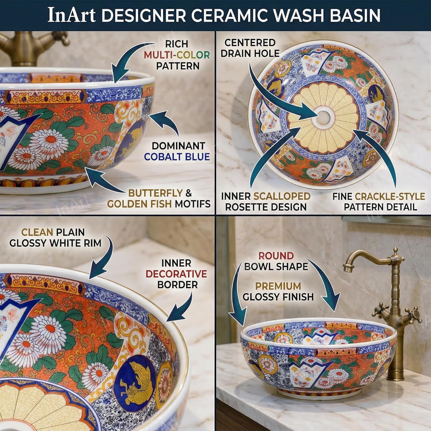 Bring boutique-hotel luxury to your vanity with the InArt round white multicolor ceramic vessel sink bowl—an artisan statement piece inspired by Mexican Talavera ceramic vessel sink styling and a round Moroccan pattern vessel sink look. Crafted from premium, high-temperature fired ceramic, this round porcelain countertop basin delivers a dense, durable body with a smooth glossy finish that’s designed to be easy to clean and maintain. Sized at 16.5 x 16.5 x 5.9 inches (W x D x H), this round artisan ceramic vessel sink offers a spacious washing area while keeping a refined countertop profile. The center drain supports efficient water drainage and a clean, balanced appearance on bathroom vanities, cabinet countertops, and modern sink consoles. Installation: This is an above-counter / countertop vessel basin designed to sit on top of your vanity. Pair it with your preferred faucet (faucet not included) and compatible drain assembly (drain not included) to complete your luxury bathroom sink setup. Care: Wipe with a damp cloth for routine cleaning and wipe with a dry cloth to buff. Use non-abrasive cleaner to help preserve the glossy ceramic surface and keep the multicolor pattern vibrant. Perfect for home renovations, powder rooms, guest bathrooms, salons, hotels, and office restrooms, this hand painted ceramic vessel basin look adds instant character. Choose InArt for a designer ceramic bathroom sink bowl that blends modern style with artisan craftsmanship—built for everyday use, made to stand out.