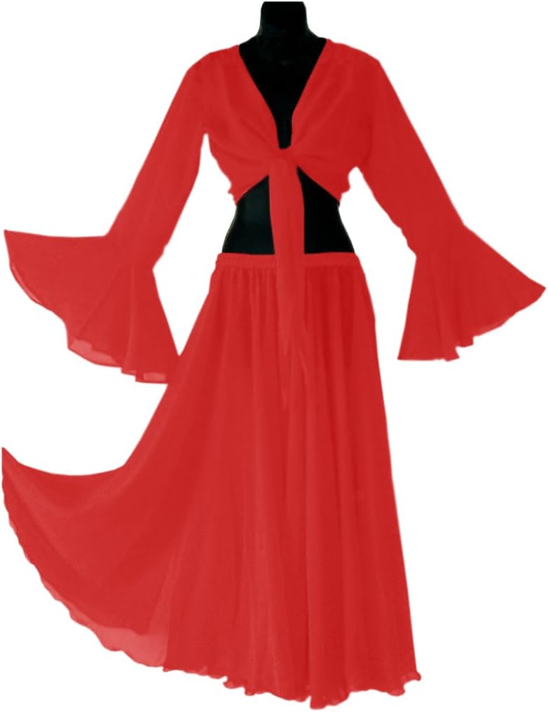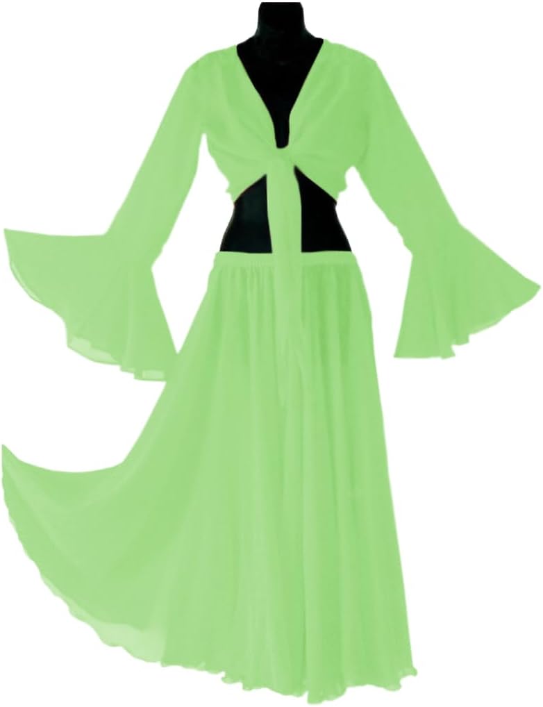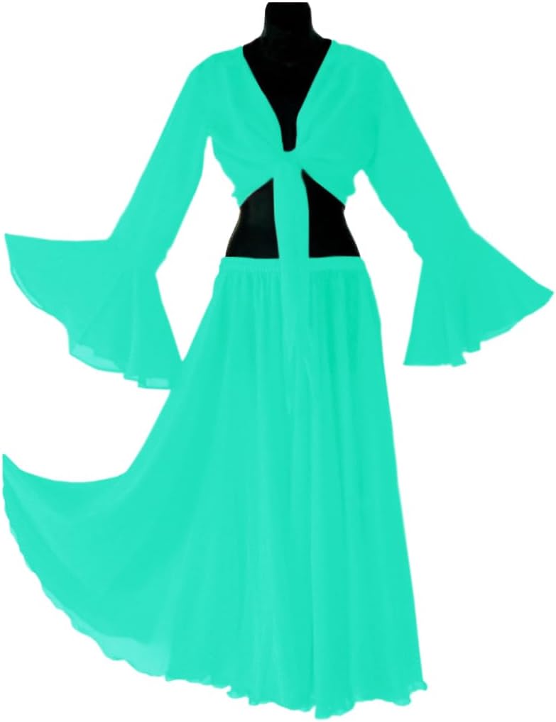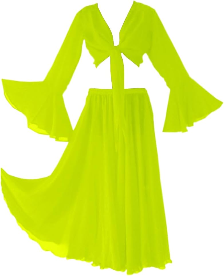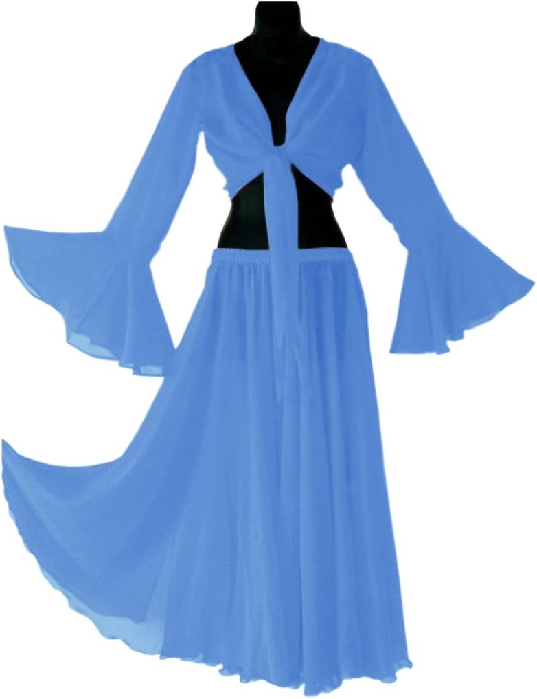 Welcome to IndianTrendy!Specification: Color: Select Color Fabric: Chiffon ( See Through - need lining for the same ) Style: Full Circle Skirt + Ruffle Bell Sleeve Top Set Size: One Size, S, M, L, XL, XXL, 3XLLength: 36 inches (91 CM) Size Chart: One Size: Waist about 25-40 inches (66-100 CM) ; Bust about 30-40 Inches (76-100 CM) Small: Waist about 23-26 Inches (58-66 CM) ; Bust about 24-30 Inches (61-76 CM) Medium: Waist about 27-30 Inches (68-76 CM) ; Bust about 30-35 Inches (76-89 CM) Large: Waist about 31-35 Inches (78-90 CM) ; Bust about 35-40 Inches (89-100 CM) X-Large: Waist about 36-39 Inches (92-99 CM) ; Bust about 40-45 Inches (100-114 CM) XX-Large: Waist about 40-43 Inches (101-110 CM) ; Bust about 45-50 Inches (114-127 CM) 3X-Large: Waist about 44-47 Inches (112-120 CM) ; Bust about 50-55 Inches (127-140 CM)Color Note: Different lighting effects contrast settings may cause a slightly different between photos and actual item, understanding & according to real product. Wash Instruction: Machine Wash.