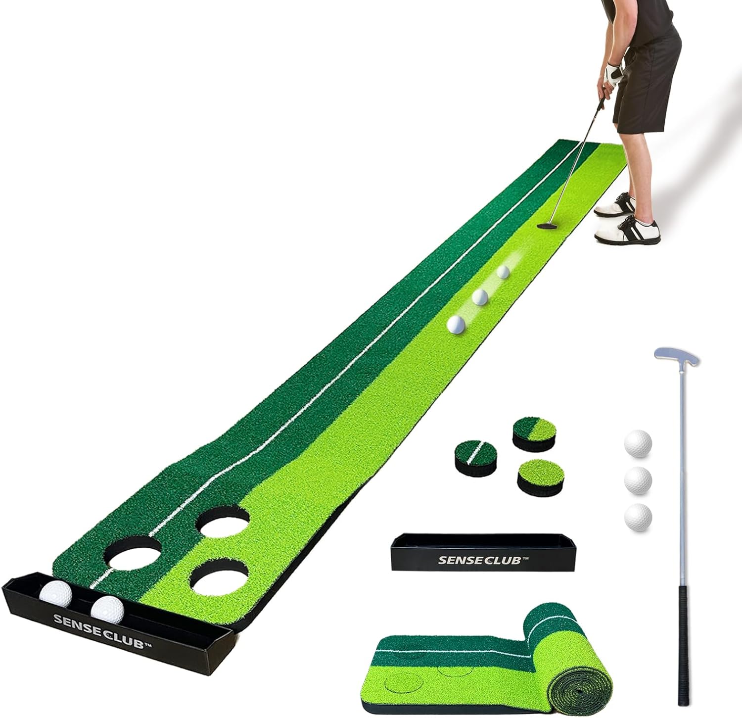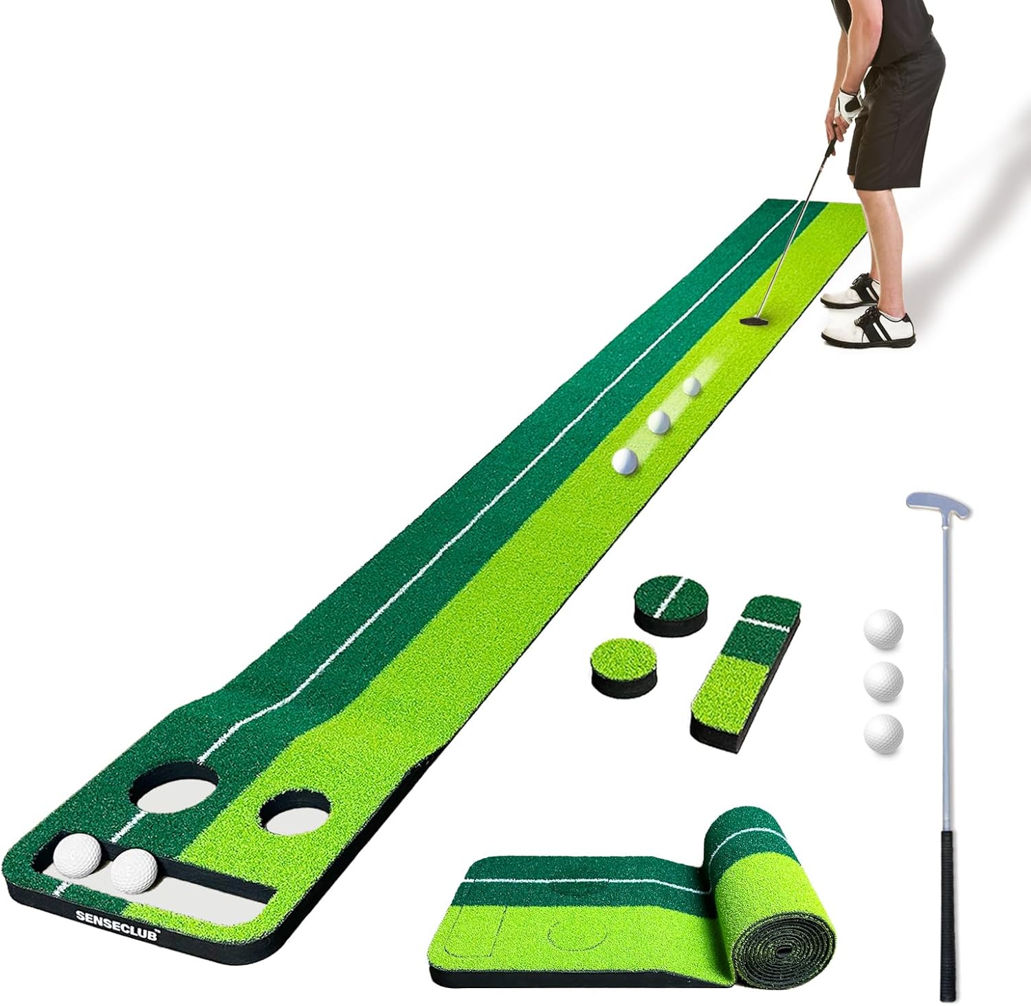 • REALISTIC GREEN: ⛳️ Included 8x1 feet long putting mat with true-roll turf surface and upslope. Features 1" thick EVA board and anti-slip rubber backlayer.