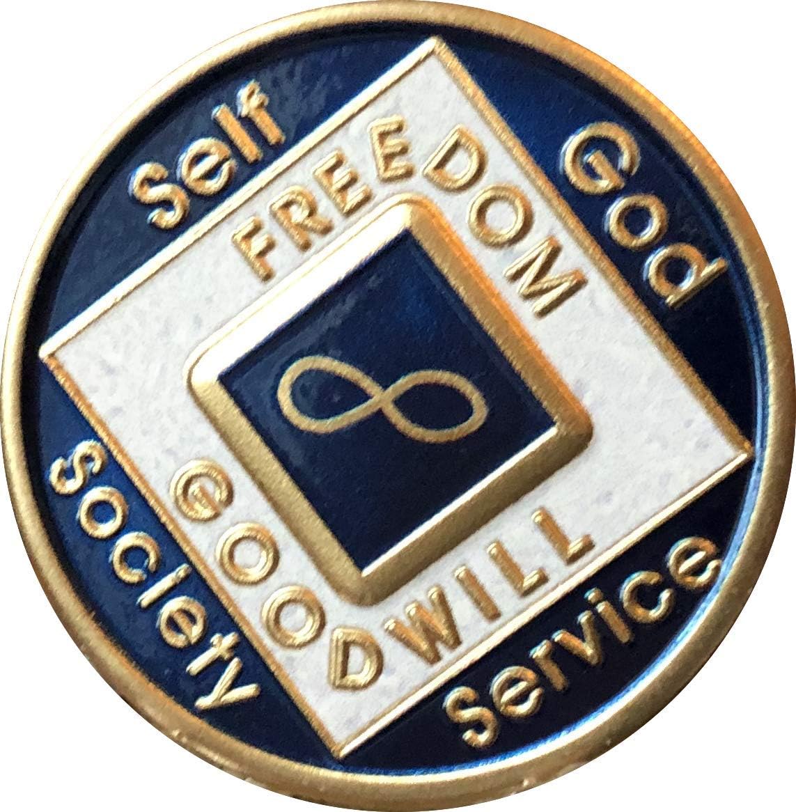 Stunning Infinity Eternity Blue and White Color NA Medallion with the Infinity symbol in the center. Size is 1 5/16" or 34x2mm This is an Official Narcotics Anonymous Medallion featuring raised 3D Graphics and Text back of the coin is black color. If it doesn't say NA on the back its not official. Excellent sobriety gift item for honoring Members of Narcotics Anonymous who have passed away