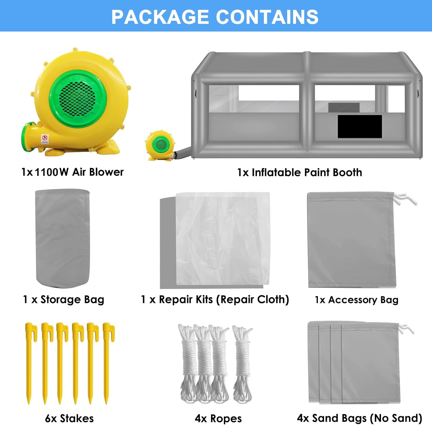 | Included Components | 1 x Repair Kits (Repair Cloth), 1x Accessory Bag, 1x 1100W Air Blower, 1x Inflatable Paint Booth, 4x Sand Bags (No Sand), 6x Stakes, 4x Ropes, 1 x Storage Bag |