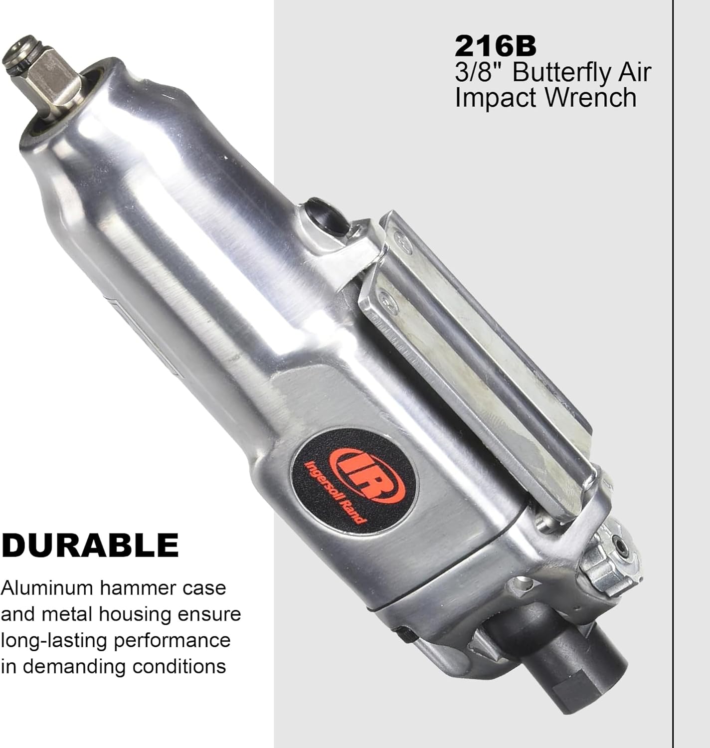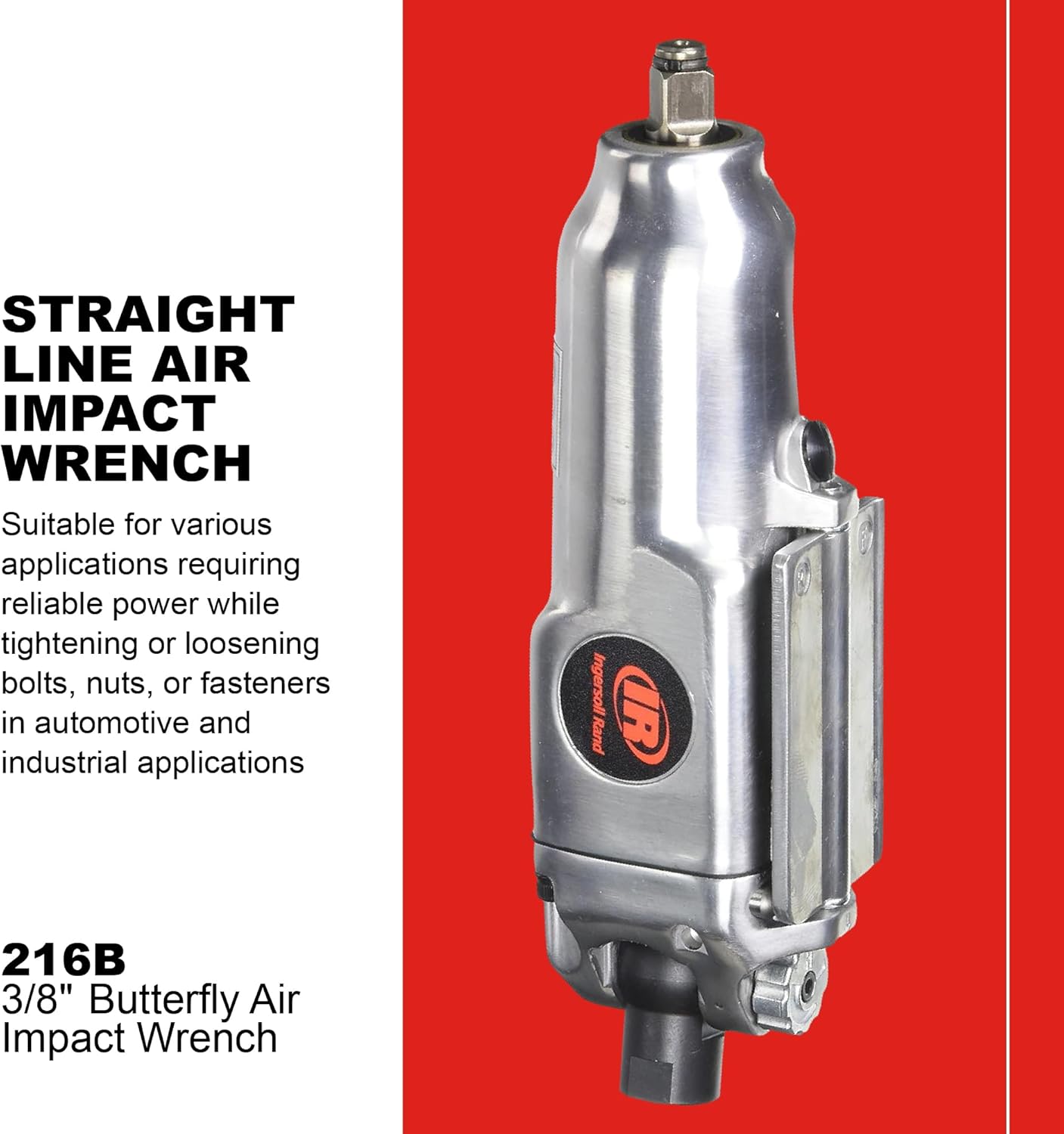 The Ingersoll Rand 216B 3/8" Air Impact Wrench is a pneumatic tool engineered for high power output in a lightweight package. With its durable aluminum housing and metal hammer case, this wrench is built to withstand tough working conditions while remaining lightweight for easy handling.Designed for accessibility and performance, the 216B features a straight grip and a compact design, making it ideal for use in tight and hard-to-reach spaces. Its ball-and-cam mechanism ensures a consistent and powerful output without the risk of stalling out for reliable performance with every use.Equipped with a square socket-retaining ring and a paddle-style forward/reverse mechanism, the 216B offers versatility and ease of use for a wide range of fastening and loosening tasks. Whether you’re working on automotive repairs, machinery assembly, or general maintenance projects, this impact wrench delivers the power and accessibility you need to get the job done efficiently and effectively. Ingersoll Rand is a trusted name in industrial innovation and excellence. With a rich legacy spanning over a century, Ingersoll Rand has continuously pushed the boundaries of engineering to deliver cutting-edge solutions that power progress across industries worldwide.