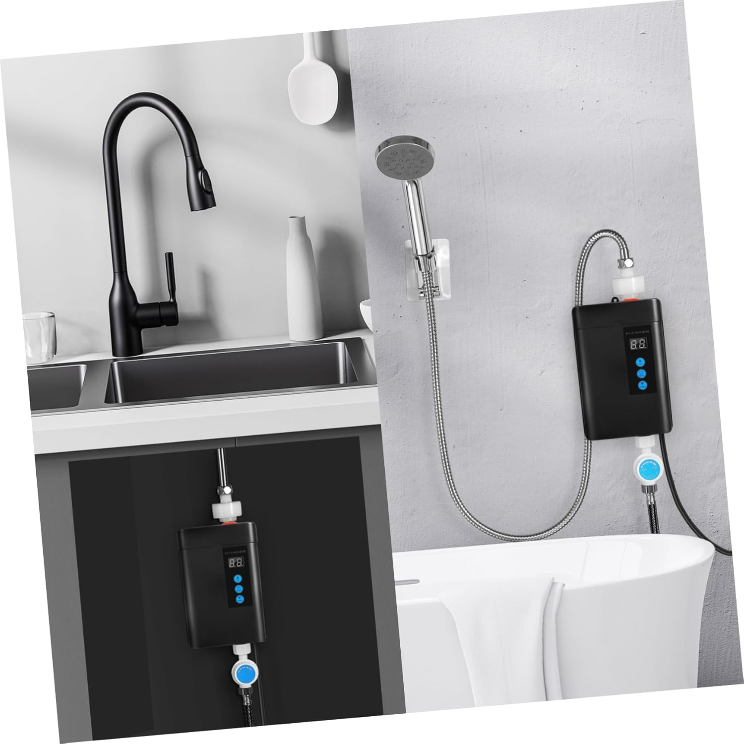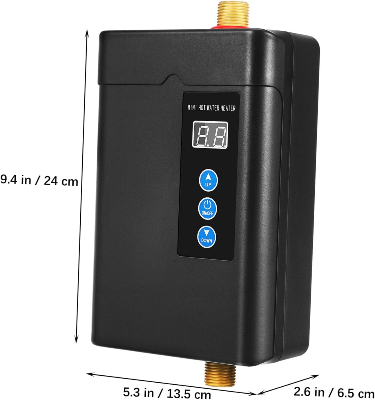 Package List 1 x electric water heater 1 x remote control 1 x manual 1 x screw kit Features -US :110V Indoor Tankless Water Heater -Material:ABS, Small Electric Water Heater - Small size: The water heater's small size means it doesn't take up much space, making it ideal for small kitchen and apartments Water Heater Electric - Easy operation: The portable water heater comes with a remote control and touch screen buttons for temperature settings Hot Water Heater Electric -Power:3000W Small Water Heater -Frequency:50-60Hz Electric Hot Water Heater -Color:Black Home Tankless Water Heater - Easy installation: The water heater has a simple installation process, saving time and effort, and making it easy to install in any room Electric Tankless Water Heater. - Fast heating: The water heater heats up quickly, providing hot water instantly, don't have to wait long for hot water Instant Heater. -Voltage: 110V Tankless Electric Heater -Size:24.00X13.50X6.50cm/9.43X5.31X2.55in Electric WaterheaterGoods InformationWater Heater The small water heater is easy to install and operate, and its compact size allows it won't take up too much space.Small Electric Water Heater It is versatile and can be used in the kitchen, bathroom, laundry room, and more.Electric Hot Water Heater Note: This item comes with US , please confirm the voltage of your area before purchasing.Small Water Heater Our portable instant water heater is designed to provide you with hot water on demand