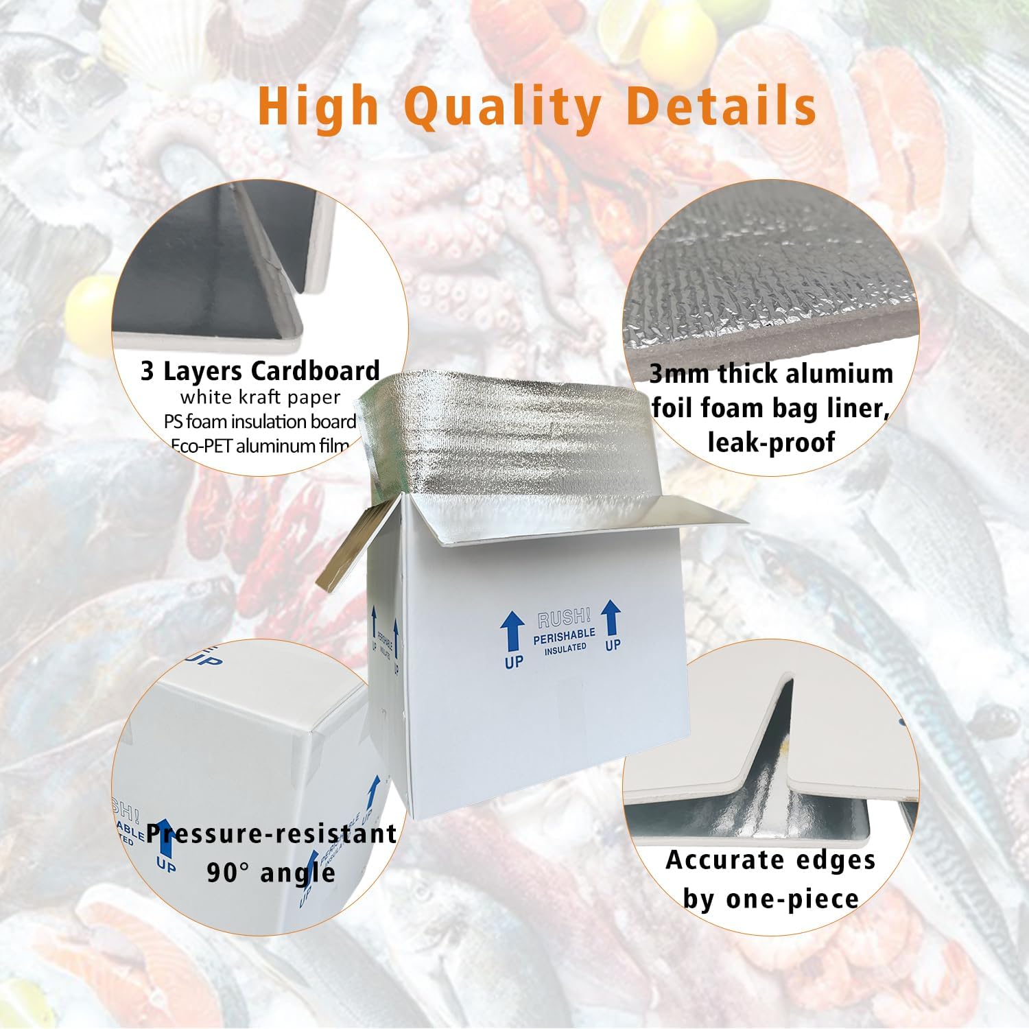 • Superior insulation – our cold shipping boxes with perfect matched aluminum foil foam liners are made of high quality leakproof insulated materials, to retard all forms heat transfer, which helps to keep your perishable hot or cold food in good condition.