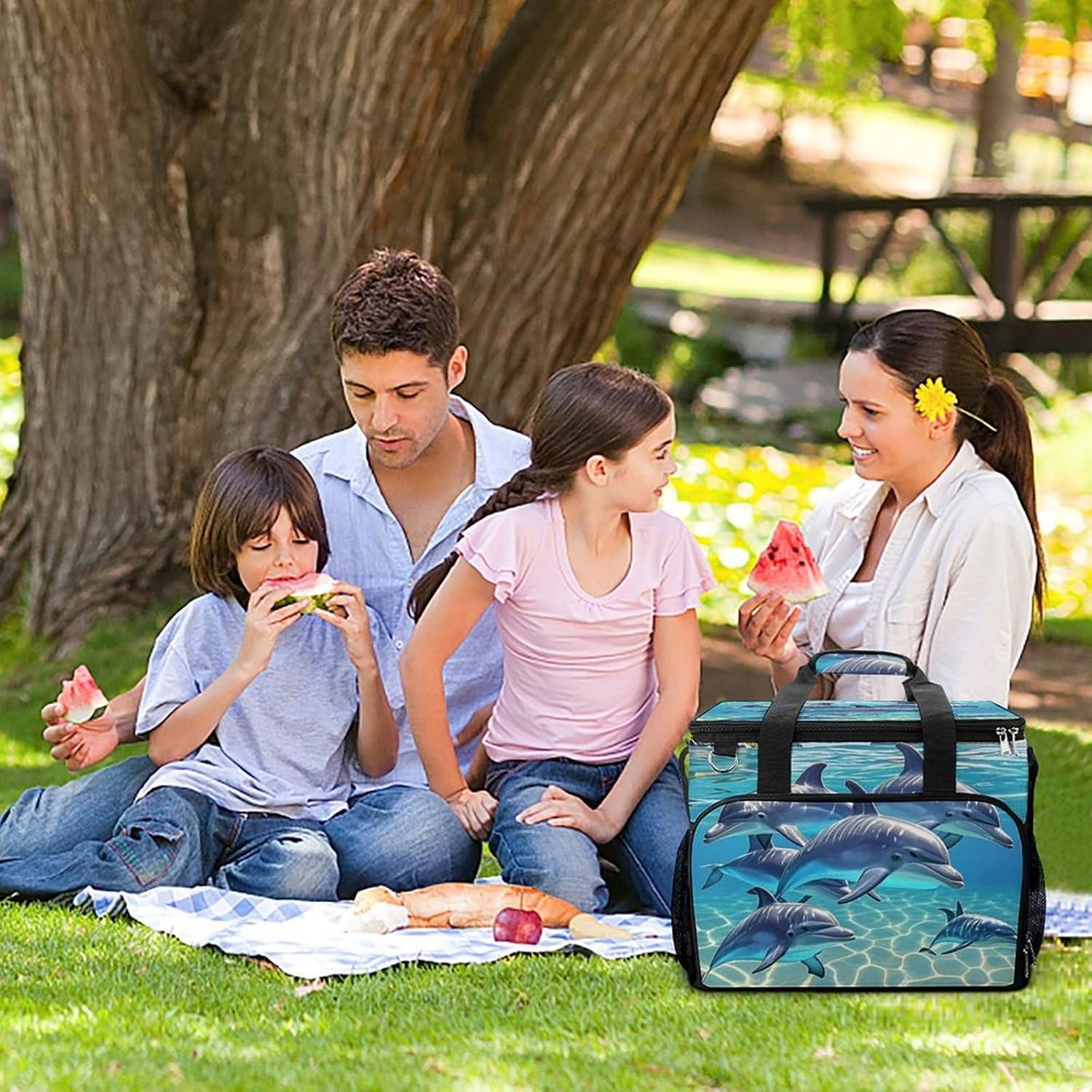 Take Your Meals Anywhere with Dolphins Art Grocery BagsFood Container Carrier Oxford Fabric Picnic Bag Heat Retaining Food Bag Camping Cooler BBQ Accessories Cute Picnic Bag with Pockets Insulated Food Bag for Work Insulated Lunch Tote Bag Camping BagTemperature Control That WorksThe upgraded aluminum foil lining creates an effective thermal barrier. Your drinks stay refreshingly cold, and your hot dishes maintain their warmth for hours. No more lukewarm meals during outdoor outings.Thoughtful Storage DesignTwo side mesh pockets - Perfect for water bottles or umbrellasFront zippered pocket - Keeps keys, phone, or condiments organizedInternal mesh pocket - Stores utensils, napkins, and small essentialsMain compartment - Spacious enough for food containers and snacksBuilt for Daily AdventuresConstructed from high-density oxford fabric with reinforced stitching at stress points. The double zippers are sturdy and smooth-operating. Reinforced handles let you carry heavy loads with confidence.Carry Your WayHandles for quick grabbingStands upright for easy packing and accessPerfect For:Picnics in the parkBeach days and pool partiesCamping and hiking tripsOutdoor concerts and festivalsDaily work lunchesGym and fitness classesRoad trips and travelGrocery shoppingSpecifications:Dimensions: 15.4 x 11.8 x 11.8 inchesMaterial: High-density Oxford fabricLining: Aluminum foil (insulated)Closure: Sturdy double zippersPockets: 2 side mesh, 1 front zipper, 1 internal meshCare: Hand wash or machine wash, do not bleachNote: Food containers and utensils shown in images are not included.