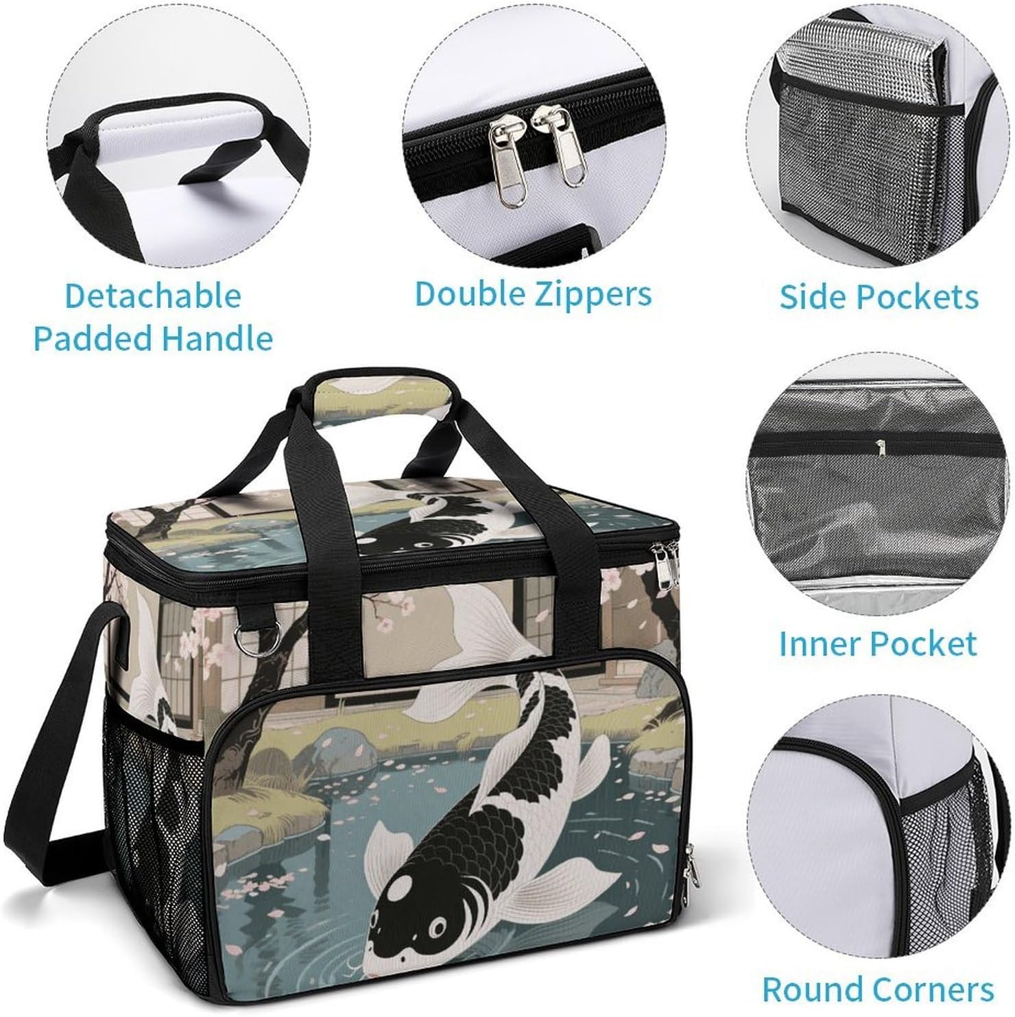 Take Your Meals Anywhere with Japanese Yin Yang Koi Fish Grocery BagsFood Container Carrier Oxford Fabric Picnic Bag Heat Retaining Food Bag Camping Cooler BBQ Accessories Cute Picnic Bag with Pockets Insulated Food Bag for Work Insulated Lunch Tote Bag Camping BagTemperature Control That WorksThe upgraded aluminum foil lining creates an effective thermal barrier. Your drinks stay refreshingly cold, and your hot dishes maintain their warmth for hours. No more lukewarm meals during outdoor outings.Thoughtful Storage DesignTwo side mesh pockets - Perfect for water bottles or umbrellasFront zippered pocket - Keeps keys, phone, or condiments organizedInternal mesh pocket - Stores utensils, napkins, and small essentialsMain compartment - Spacious enough for food containers and snacksBuilt for Daily AdventuresConstructed from high-density oxford fabric with reinforced stitching at stress points. The double zippers are sturdy and smooth-operating. Reinforced handles let you carry heavy loads with confidence.Carry Your WayHandles for quick grabbingStands upright for easy packing and accessPerfect For:Picnics in the parkBeach days and pool partiesCamping and hiking tripsOutdoor concerts and festivalsDaily work lunchesGym and fitness classesRoad trips and travelGrocery shoppingSpecifications:Dimensions: 15.4 x 11.8 x 11.8 inchesMaterial: High-density Oxford fabricLining: Aluminum foil (insulated)Closure: Sturdy double zippersPockets: 2 side mesh, 1 front zipper, 1 internal meshCare: Hand wash or machine wash, do not bleachNote: Food containers and utensils shown in images are not included.