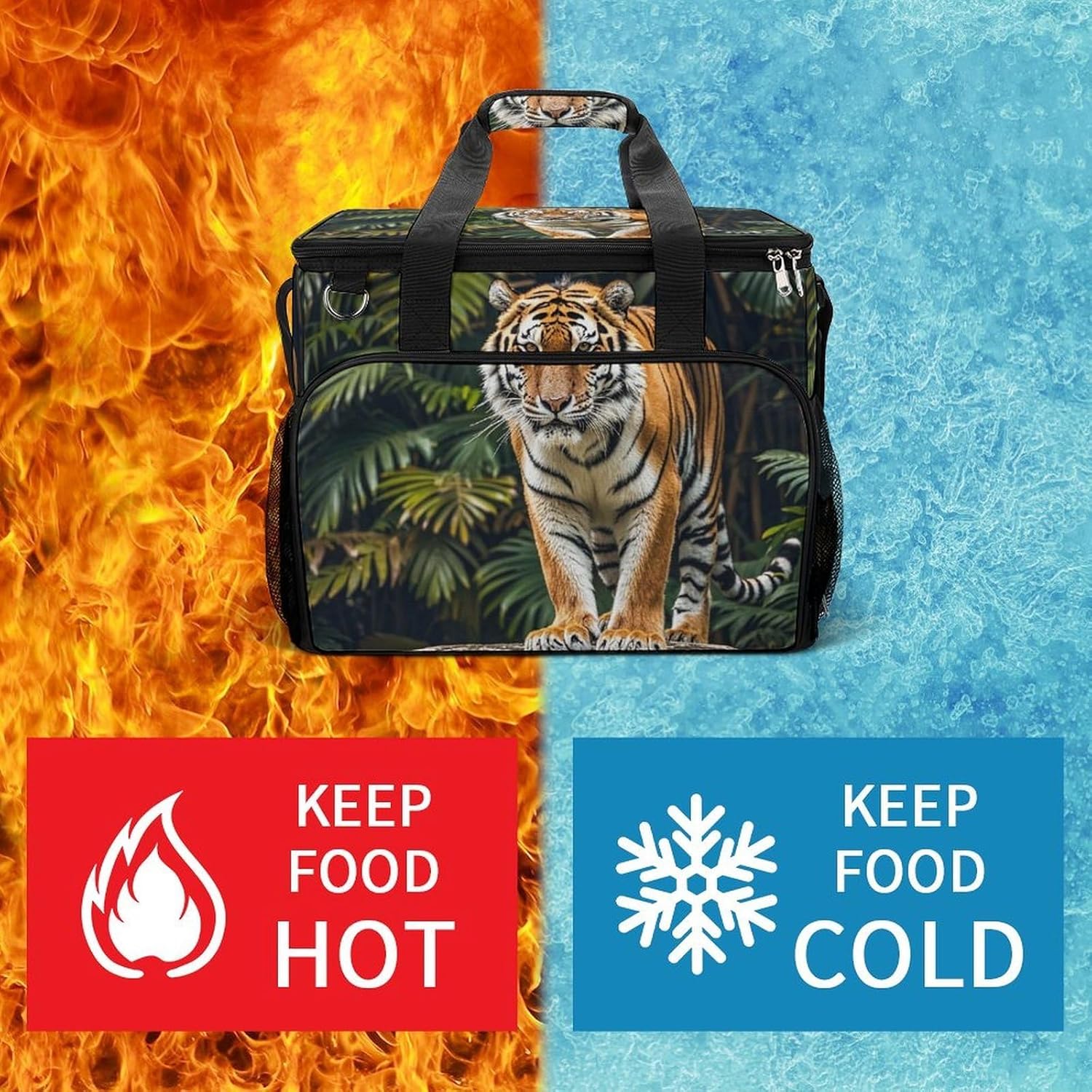 Take Your Meals Anywhere with Tiger on A Boulder in The Jungle Grocery BagsFood Container Carrier Oxford Fabric Picnic Bag Heat Retaining Food Bag Camping Cooler BBQ Accessories Cute Picnic Bag with Pockets Insulated Food Bag for Work Insulated Lunch Tote Bag Camping BagTemperature Control That WorksThe upgraded aluminum foil lining creates an effective thermal barrier. Your drinks stay refreshingly cold, and your hot dishes maintain their warmth for hours. No more lukewarm meals during outdoor outings.Thoughtful Storage DesignTwo side mesh pockets - Perfect for water bottles or umbrellasFront zippered pocket - Keeps keys, phone, or condiments organizedInternal mesh pocket - Stores utensils, napkins, and small essentialsMain compartment - Spacious enough for food containers and snacksBuilt for Daily AdventuresConstructed from high-density oxford fabric with reinforced stitching at stress points. The double zippers are sturdy and smooth-operating. Reinforced handles let you carry heavy loads with confidence.Carry Your WayHandles for quick grabbingStands upright for easy packing and accessPerfect For:Picnics in the parkBeach days and pool partiesCamping and hiking tripsOutdoor concerts and festivalsDaily work lunchesGym and fitness classesRoad trips and travelGrocery shoppingSpecifications:Dimensions: 15.4 x 11.8 x 11.8 inchesMaterial: High-density Oxford fabricLining: Aluminum foil (insulated)Closure: Sturdy double zippersPockets: 2 side mesh, 1 front zipper, 1 internal meshCare: Hand wash or machine wash, do not bleachNote: Food containers and utensils shown in images are not included.