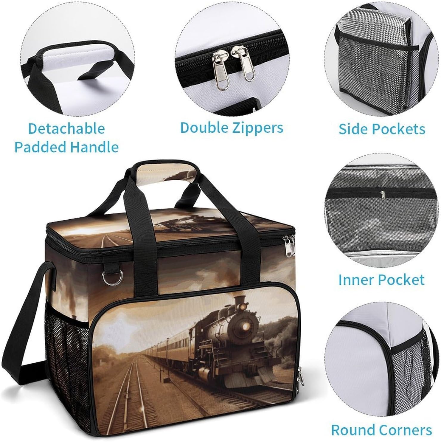 Take Your Meals Anywhere with Train And Railway Grocery BagsFood Container Carrier Oxford Fabric Picnic Bag Heat Retaining Food Bag Camping Cooler BBQ Accessories Cute Picnic Bag with Pockets Insulated Food Bag for Work Insulated Lunch Tote Bag Camping BagTemperature Control That WorksThe upgraded aluminum foil lining creates an effective thermal barrier. Your drinks stay refreshingly cold, and your hot dishes maintain their warmth for hours. No more lukewarm meals during outdoor outings.Thoughtful Storage DesignTwo side mesh pockets - Perfect for water bottles or umbrellasFront zippered pocket - Keeps keys, phone, or condiments organizedInternal mesh pocket - Stores utensils, napkins, and small essentialsMain compartment - Spacious enough for food containers and snacksBuilt for Daily AdventuresConstructed from high-density oxford fabric with reinforced stitching at stress points. The double zippers are sturdy and smooth-operating. Reinforced handles let you carry heavy loads with confidence.Carry Your WayHandles for quick grabbingStands upright for easy packing and accessPerfect For:Picnics in the parkBeach days and pool partiesCamping and hiking tripsOutdoor concerts and festivalsDaily work lunchesGym and fitness classesRoad trips and travelGrocery shoppingSpecifications:Dimensions: 15.4 x 11.8 x 11.8 inchesMaterial: High-density Oxford fabricLining: Aluminum foil (insulated)Closure: Sturdy double zippersPockets: 2 side mesh, 1 front zipper, 1 internal meshCare: Hand wash or machine wash, do not bleachNote: Food containers and utensils shown in images are not included.