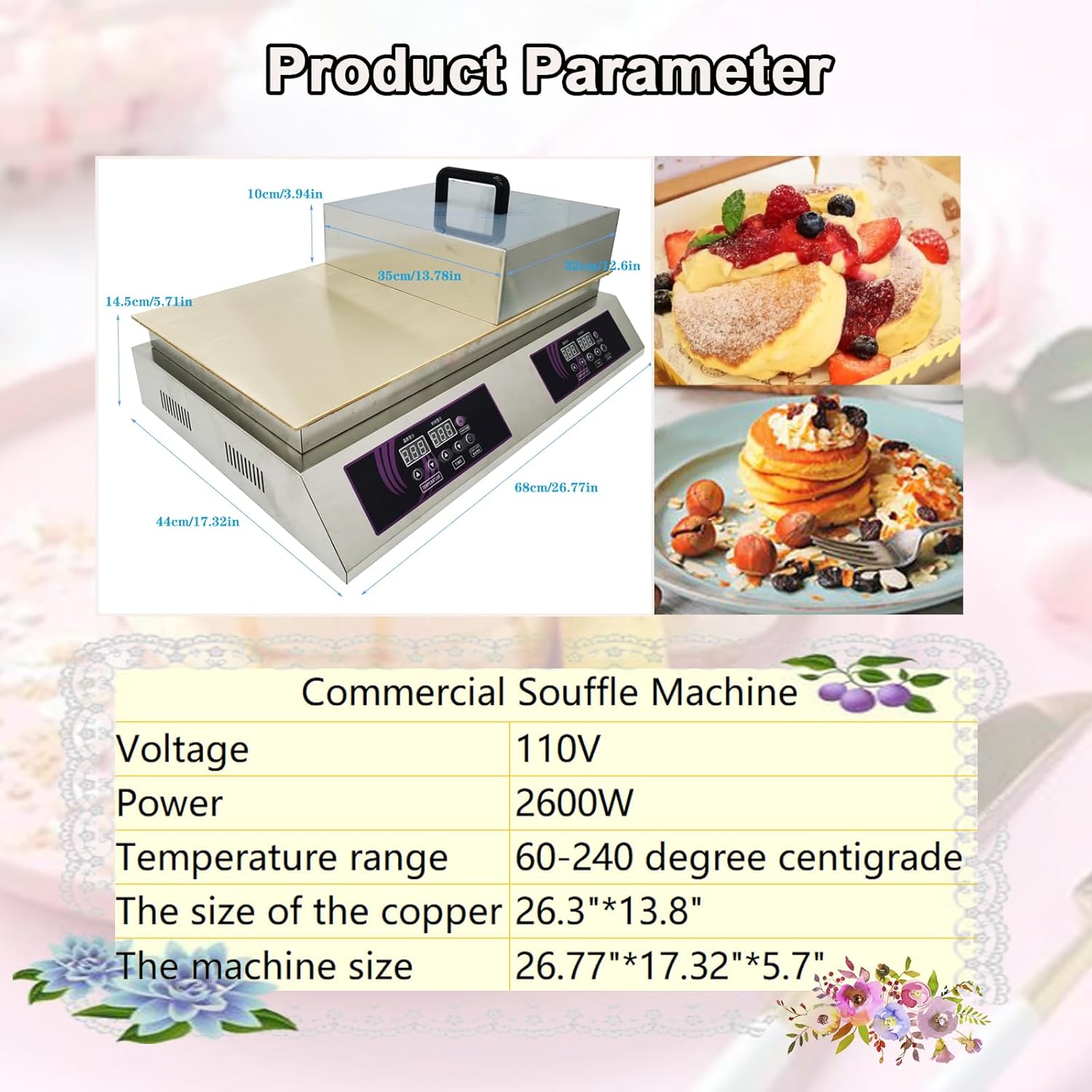 Chimney Cake Machine Features: 1. Stainless steel body, small and mini, 2 stations, can bake 2 bread at the same time. 2. There is a tray at the bottom of the oven to clean up dripping oil and crumbs. 3. M-type heating tube, heat more evenly. 4. With 2 stainless steel molds and wooden handles to prevent burns. 5. Transparent skylight, easy to observe the bread at any time. 6. Knob design, simple operation. 7. With a handle, easy to open the cover, so as not to burn.Double Plate Souffle Machine Parameters:Voltage: 110V Temperature range: 0-240℃ Material of machine: Stainless Steel Material of heating plate: Copper Machine size: 27.5×17.5×6.1in Copper plate size:26.3×13.8×0.35in Shipping size: 27.56×17.52×10.04in Shipping weight: 55lb