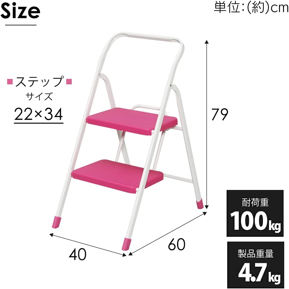 Lightweight and durable. Enough load capacity for up to 220.5 lbs (100 kg). Lightweight and easy to carry. 2-tier type 2 tiers for easy access Non-skid leg caps to prevent floor scratches Compact storage. When not in use, it folds into a compact size, so you don't have to worry about storage space. Easy to open and close Easy ring closure stopper. Simply pull the ring forward and slide the lock into place. Large Step The stepladder has a wide design that provides stability and makes it easy to climb. Frame shape that is easy to sit on. The handle of the pipe is gently bent and can be hung on the seat.