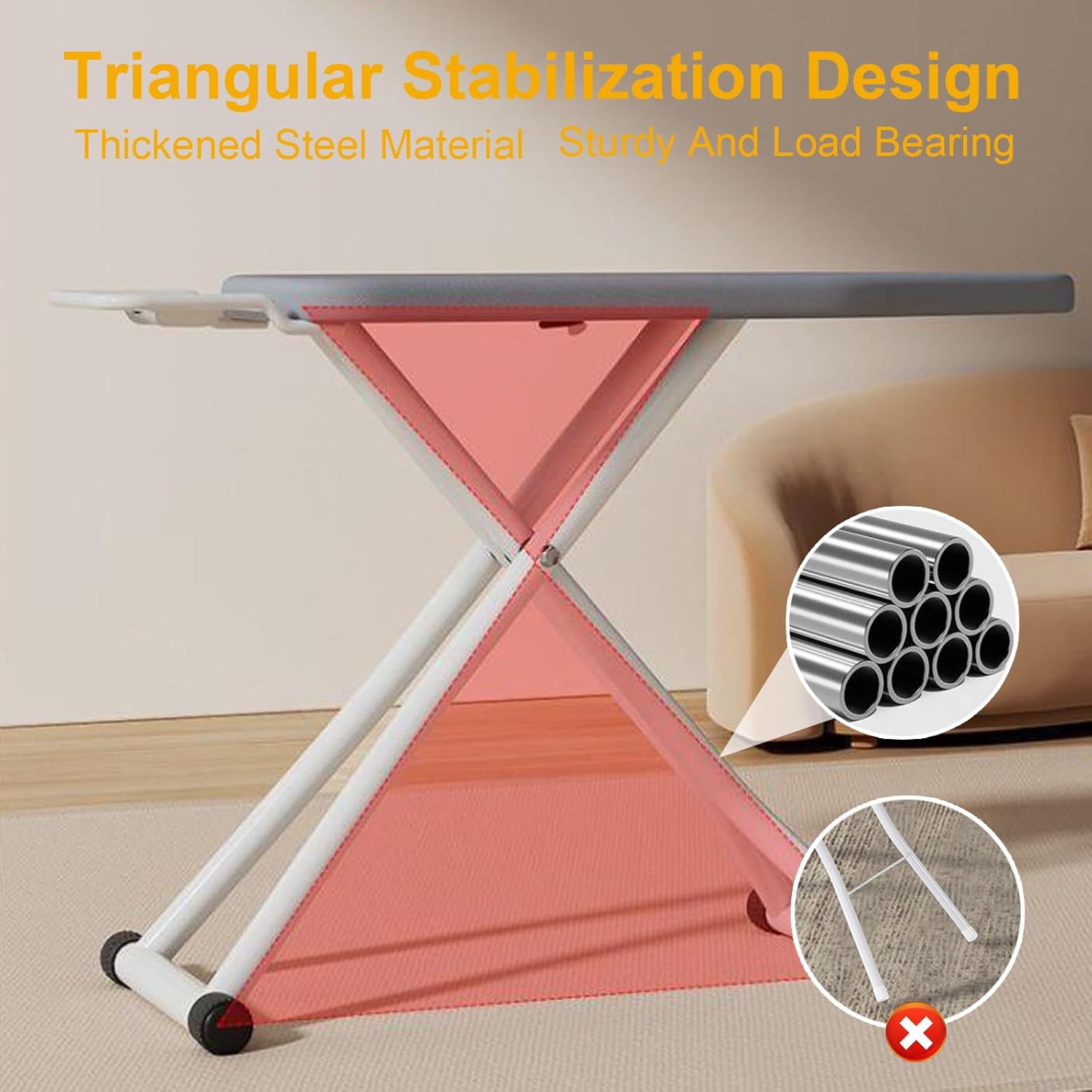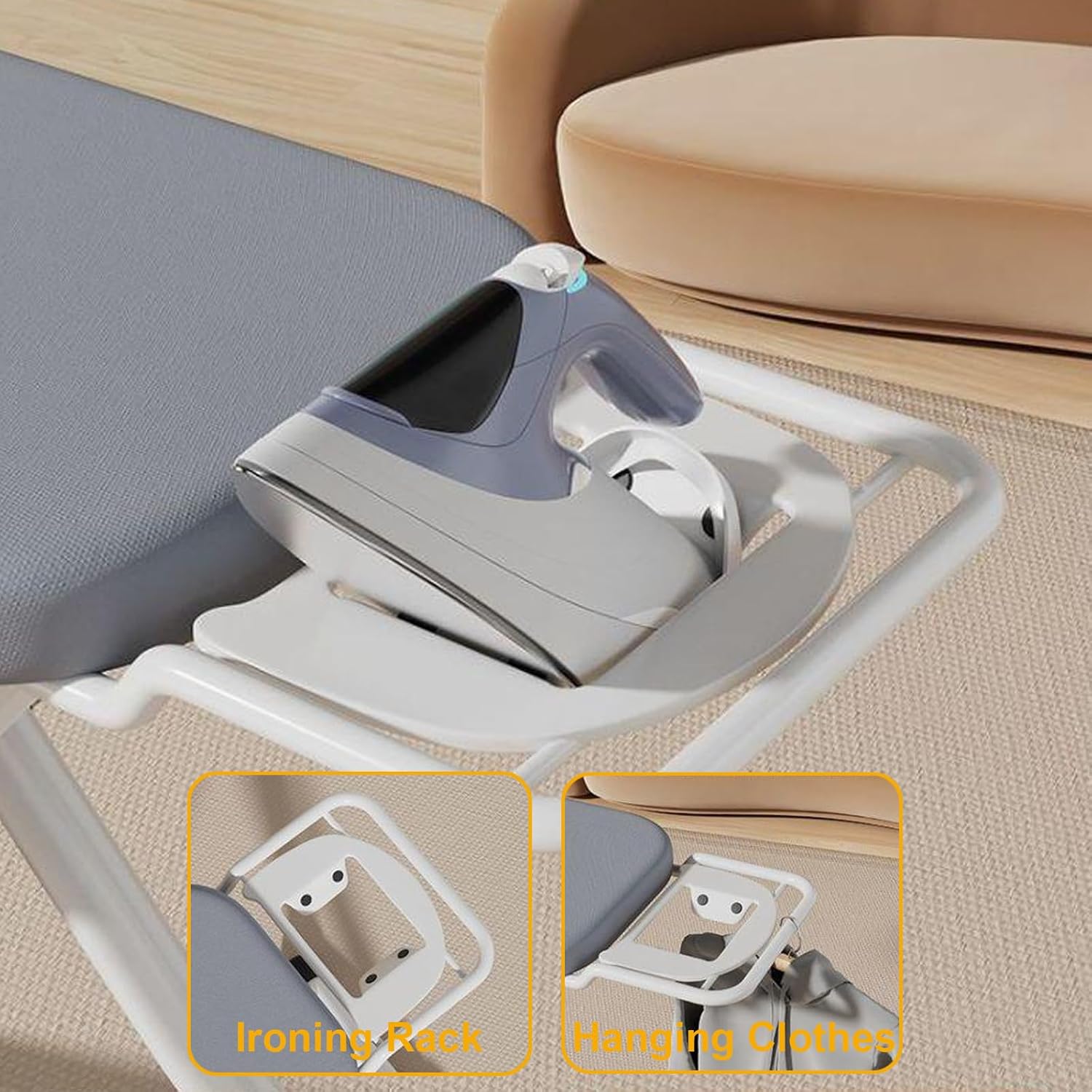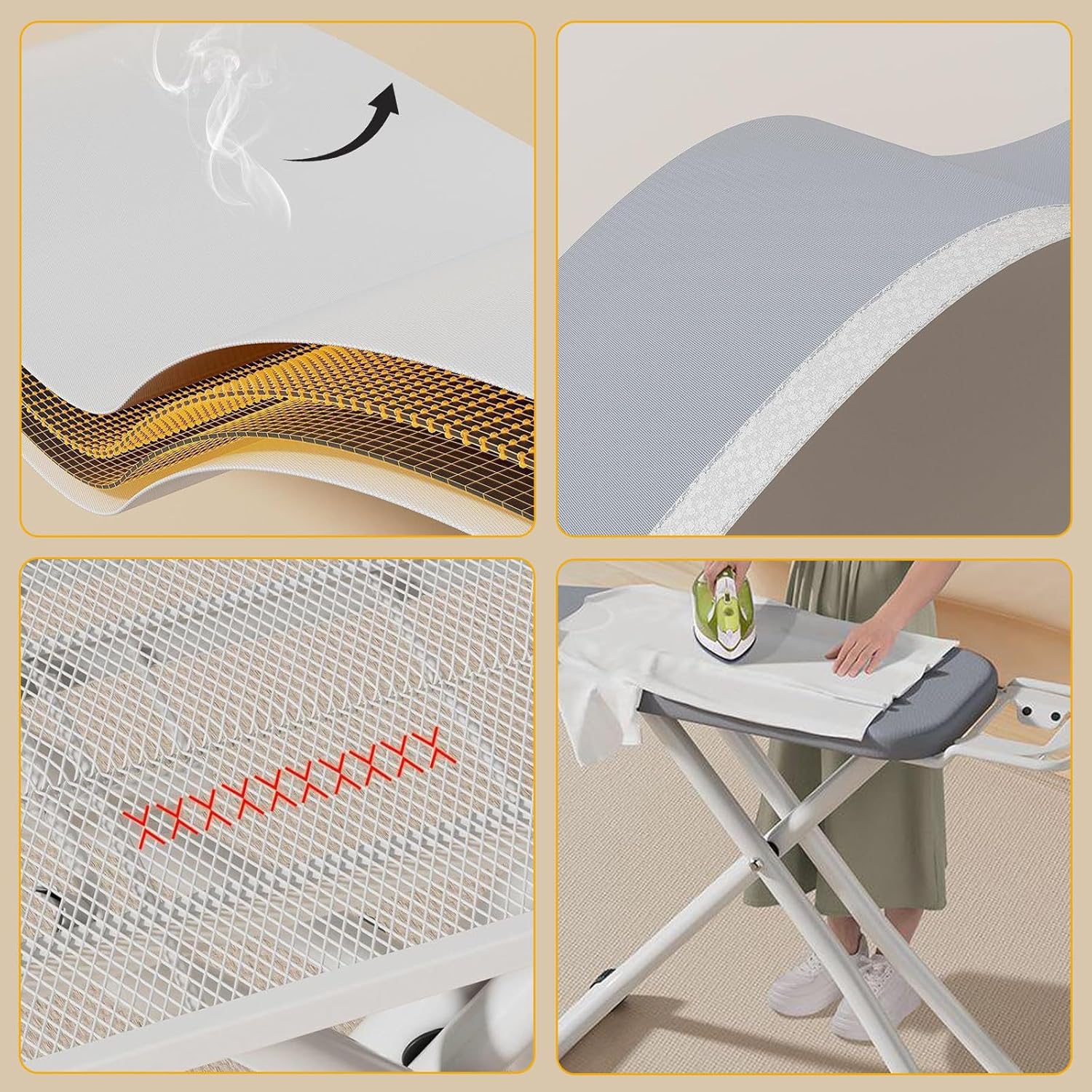 Features:1. Breathable metal mesh for excellent ventilation and smoother steam circulation.2. Foldable and portable design makes moving and storing effortless, perfect for small spaces like closets, living rooms, and laundry rooms.3. Thickened and thickened stand with non-slip feet ensures safe and stable support during every ironing session. Trustworthy quality.4. Versatile 7-level height adjustment accommodates people of all heights, allowing for effortless ironing whether standing or sitting.5. User-friendly ironing stand securely and securely holds your hot iron, maintaining optimal heat dissipation. Easy to access and keep organized during use.6. Removable outer cover with pure cotton padding provides excellent breathability and effective heat dissipation without sticking or damaging fabrics.Specifications:Material: SteelColor: White + GrayUnfolded Dimensions: 142 * 92 * 21cm / 56 * 36 * 8in; Ironing Surface: 120 * 38cm / 47 * 15inPackage Included: Insulation net, sleeve ironing board, measuring tape, cleaning sleeve, cloth coverIf you encounter any problems, please contact us immediately and we will provide you with a satisfactory solution.
