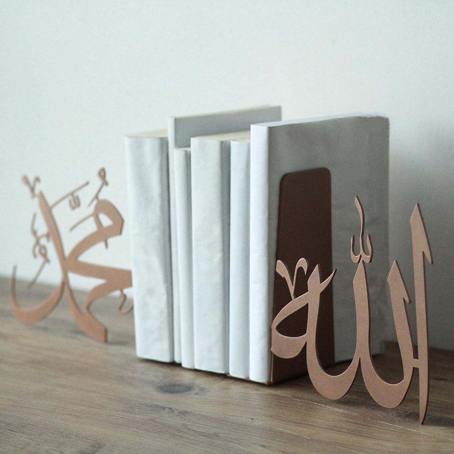 Product name:Allah (SWT) and Mohammad (PBUH) Metal BookendMaterial : MetalSize : Detailly showed on photosWeights : 10 ouncesAnother unique product added to our innovative collection ! This set of islamic metal bookends create a sophistication decor while helping to organize your books, specially islamic ones like quran.Allah (SWT) Mohammad (pbuh) Bookend Decor has an elagant look . It will enrich your library. It is made of mild steel metal. Delicately coat painted which makes them extremely durable and resistant to atmospheric conditions.Price is per set of bookends.Our Islamic bookend arts "High Quality" free standing decors which can stand alone. Spruce up your table, desk, or shelf with this handcrafted freestanding.We have many other style options in our store.The most meaningful alternative for wedding, birthday, mother's day, father's day, eid, ramadan or housewarming gift. Slight welding abd bending imperfections may occur but not recognized easily. Bookend artworks complete your home decor and they are ideal ramadan decoration that enhance the atmosphere of your home during Mubarak Ramadan month/eid and remind you of Islamic values every time you look at it.Made in Türkiye
