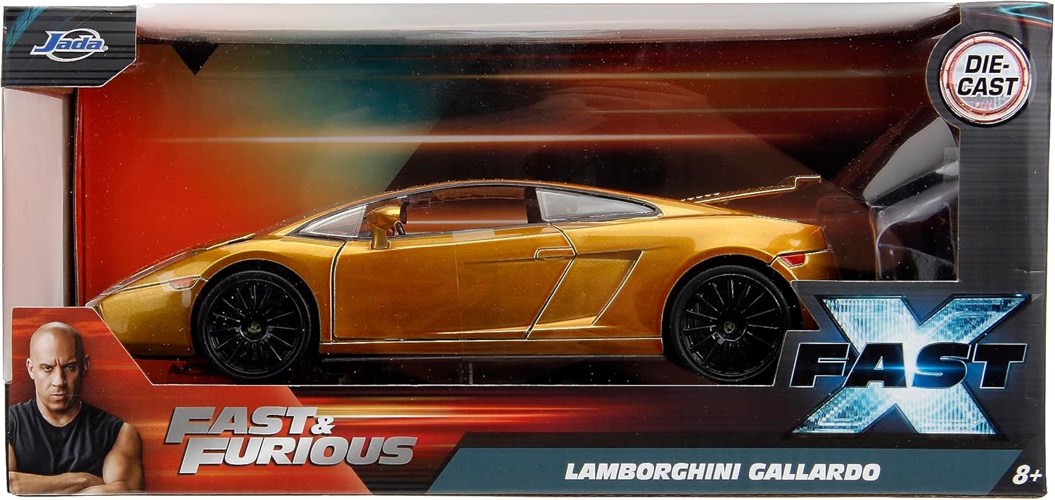 Help Dom and his crew as they continue their global exploits in the unstoppable franchise built on speed! Featuring styling cues directly from the movies, these die-cast vehicles are sure to live up to the standards of fans and collectors alike. From Fast X, the Gold Lamborghini Gallardo features an opening hood, doors, and a premium deco. Collect them all to assemble your own fast team and save the day!