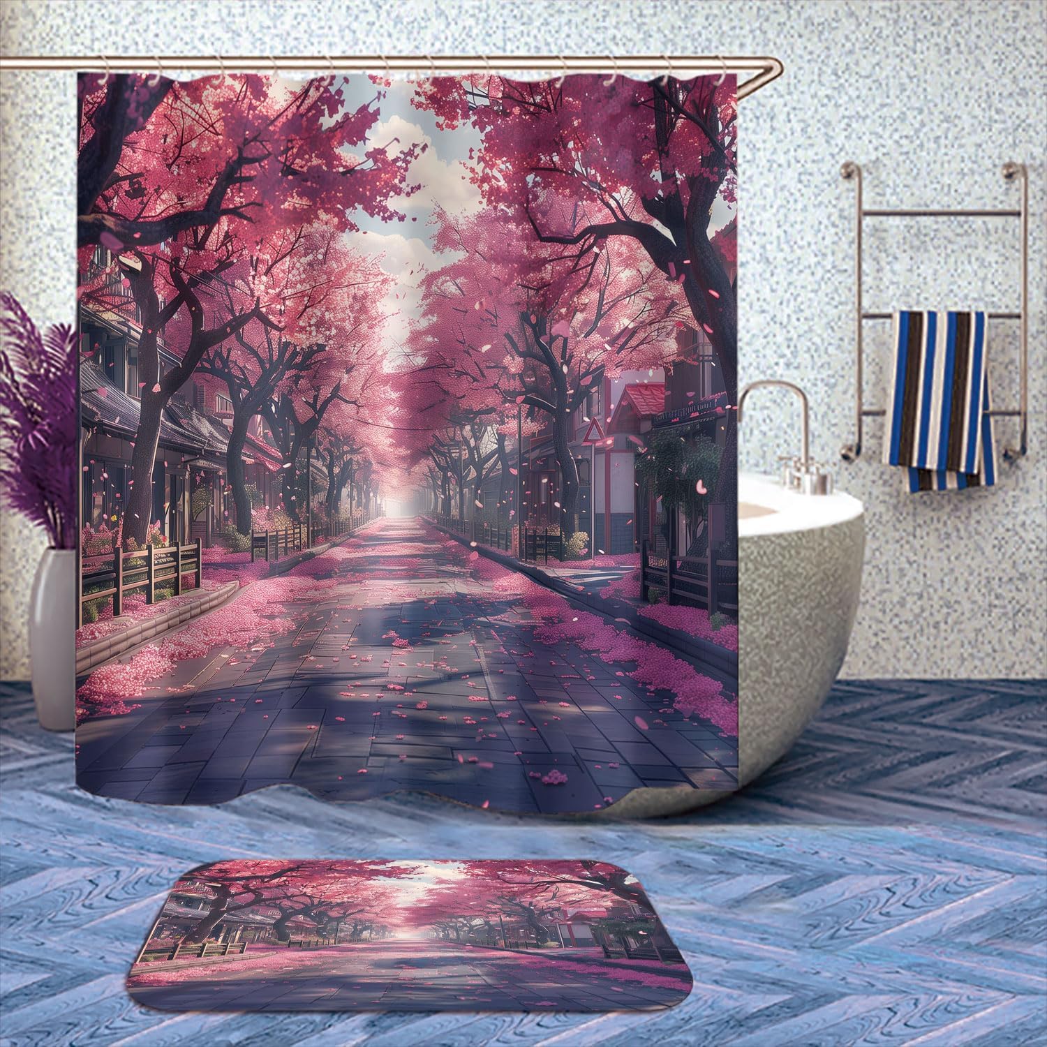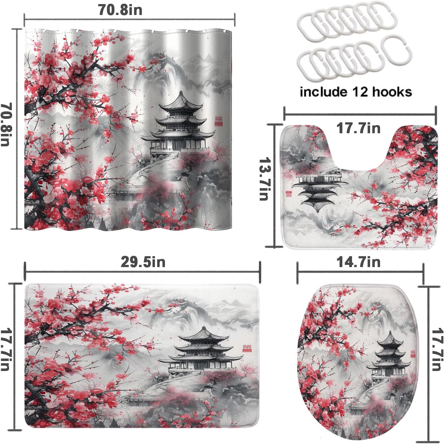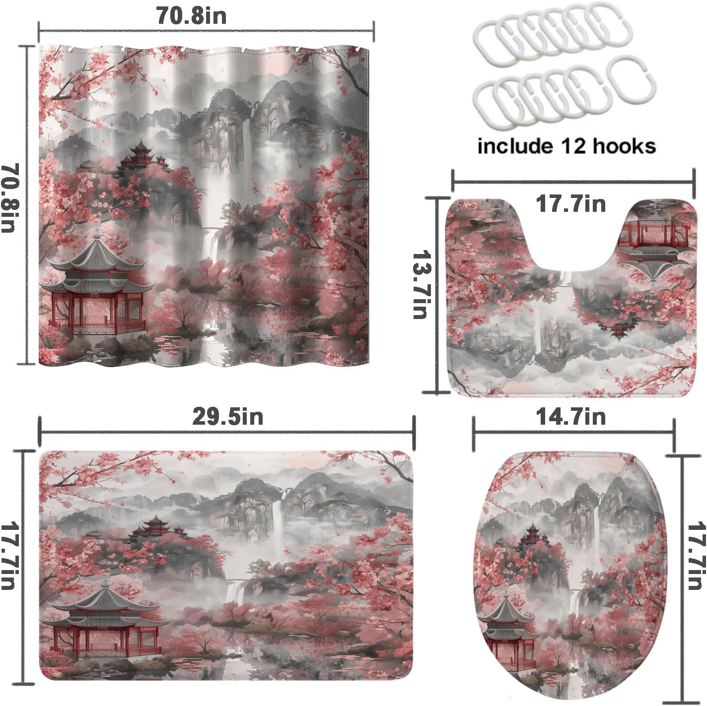 Japanese Cherry Blossom Bathroom Shower Curtain Set with Rugs,Toilet Lid Cover, Bath MatFeatures:Our shower curtains set is a nice gift choice. Be it a housewarming or a birthday, bless your loved ones with this vibrant themed set that will add a fresh burst of color and charm to their bathroom. The set is not just a bundle of decorations, but also practical pieces to take their shower experience higher.Material:Shower curtain: polyesterRug, cover and mat: velvet, non slip backingSize:Shower curtain: about 71.65 x 71.65 inches/ 182 x 182 cmNon slip rug: about 17.72 x 29.53 inches/ 45 x 75 cmToilet lid cover: about 17.72 x 13.78 inches/ 45 x 35 cmU shaped bath mat: about 17.72 x 14.96 inches/ 45 x 38 cmPackage includes:1 x shower curtain1 x non slip rug1 x toilet lid cover1 x U shaped bath matNotes:Manual measurement, please allow slight errors on size.The color may exist a slight difference due to different screen displays.