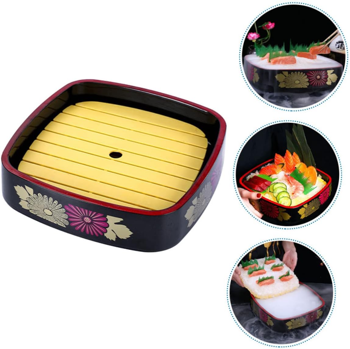 Package List 1 x Tray (Including Hollow Plate) Characteristics -Color:Yellow Food Dish -Material:ABS Japanese Style Sushi Plate -Size:23.50X23.50X5.30cm/9.24X9.24X2.08in Sushi Display Plate - Made of ABS material, this dish for sushi serving is very sturdy and can withstand long term Decorative Sushi Tray. - Easy to clean and take, light weight and compact size also convenient for you to store Home Sushi Tray. - Fit for sharing dried fruit, brochette, dessert and snacks with guests in leisure time or at the party Sushi - Classic chrysanthemum pattern and reasonable design, this plate is simple and fashion, smooth and flat bottom Multi-function Sushi - Not easy to fade, deform or break, and reliable, bringing you a satisfactory using experience Sushi Serving Goods DescriptionSushi Plate Suitable for restaurants, and family dinners.Home Sushi Tray This is a sushi plate, and .Restaurant Sushi Plate for storing sashimi, sushi, and other food.Decorative Food Plate The appearance adds natural beauty to your desserts, appetizers, sushi and other delicacies