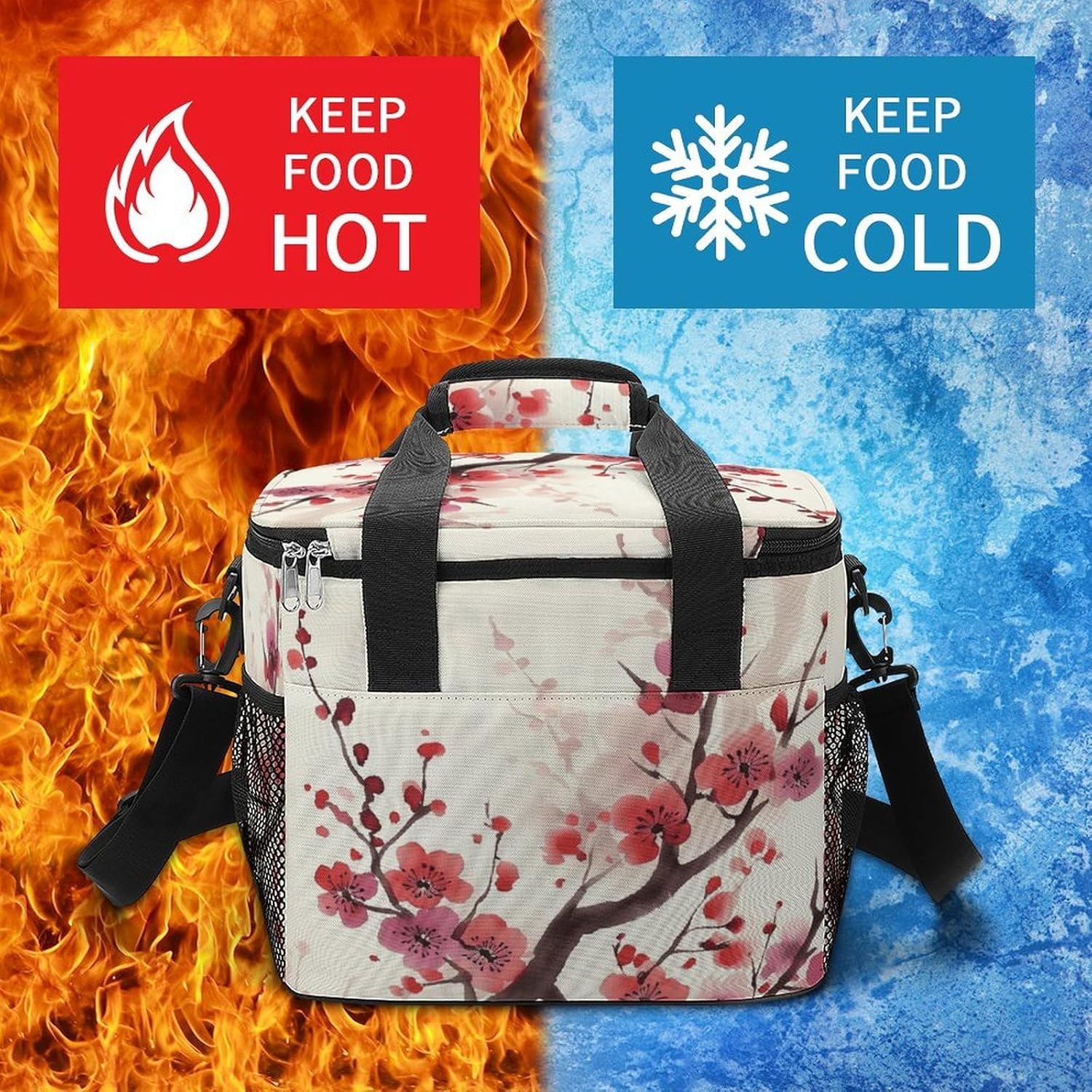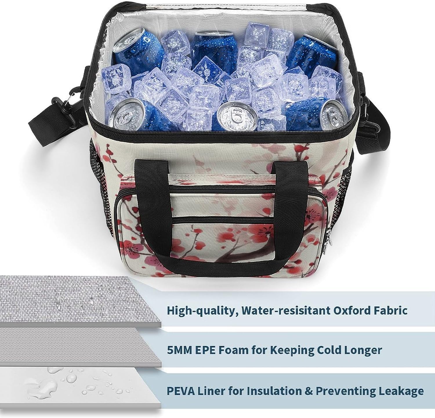 When you're looking for a reliable way to keep your food and drinks fresh while on the move, our Japanese Spring Plum Floral insulated cooler tote is the perfect solution. Made from high-density Oxford cloth with an upgraded aluminum foil lining, it offers superior insulation that maintains the temperature of your items for hours. The leakproof design ensures no messy spills, and the sturdy construction means it can handle the rigors of daily use, whether you're commuting to work or heading out for a weekend camping trip.The 22.5L large capacity provides ample space for all your essentials, from sandwiches and salads to cans of soda and bottles of water. The comfortable 66cm straps make it easy to carry, and the compact vertical design doesn't take up unnecessary space in your car or backpack. Whether you're packing a meal for the office, preparing for a family picnic, or stocking up on groceries, this cooler bag has you covered.Forget about flimsy coolers that fall apart after a few uses or fail to keep your food fresh. Our reusable cooler tote combines practicality, durability and style in one package. Its neutral design works for everyone, and its versatility makes it a must-have accessory for anyone with an active lifestyle. Invest in a cooler bag that meets all your needs and simplifies your on-the-go eating experience. Lightweight Cooler Bags Oxford Cloth Cooler Bags Ice Packs Reinforced Handle Ice Chest Cooler Bag Tote Cooler Bag Versatile Cooler Bags Portable Insulated Cooling Everyday Cooler