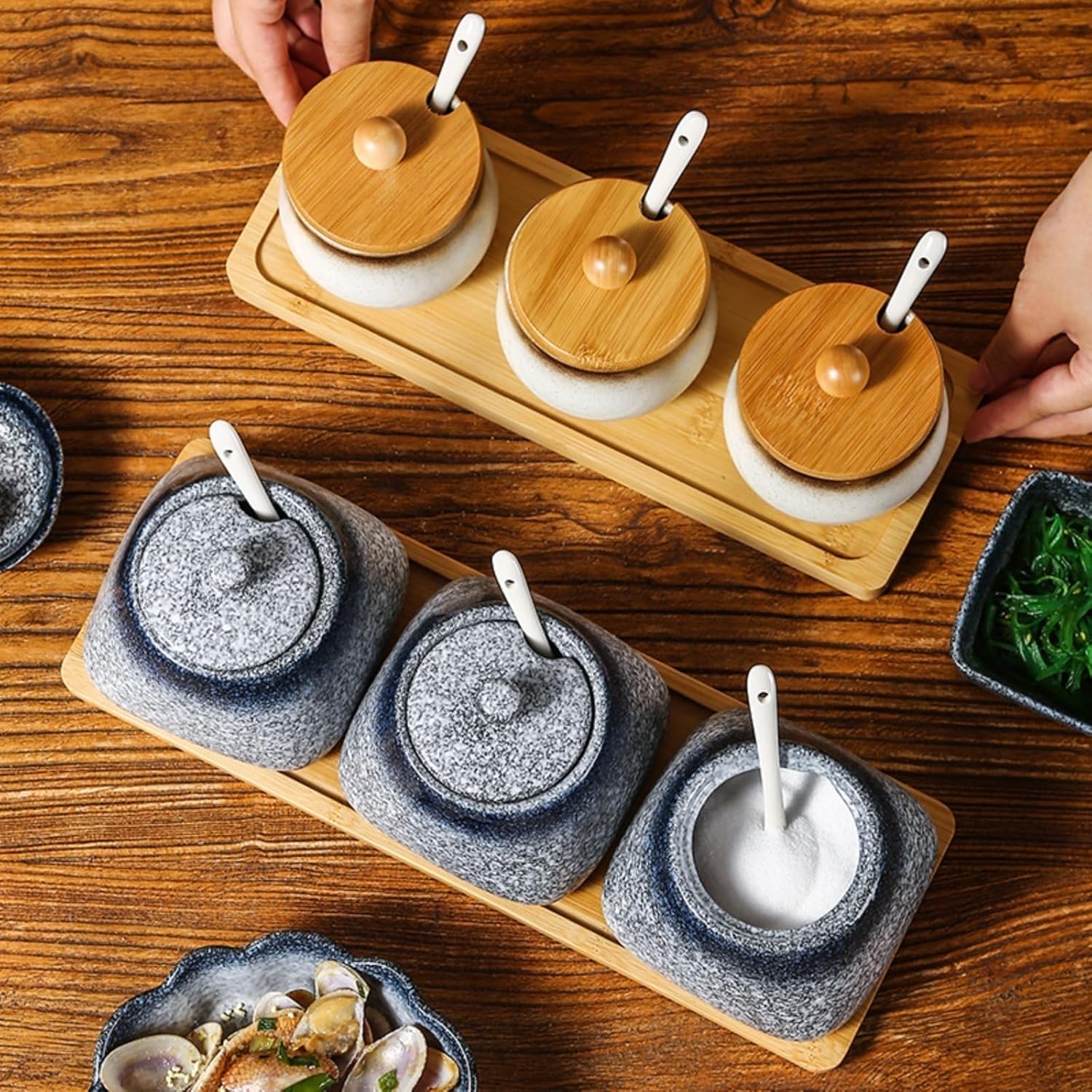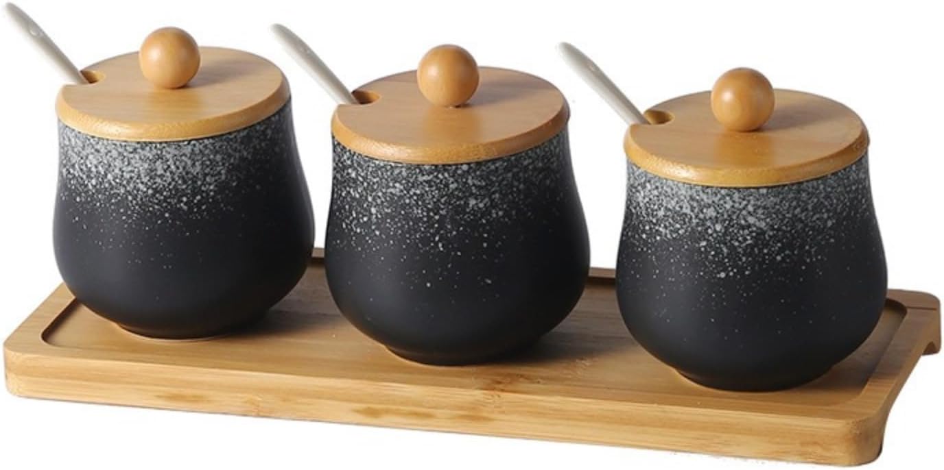Ceramic Seasoning Jars Set with Bamboo Tray Category: Kitchen Storage Features: Made of high-quality ceramic with natural bamboo lids Airtight bamboo lids help keep seasonings fresh Each jar comes with a matching ceramic spoon Bamboo tray keeps jars neatly organized Easy to clean and maintain Suitable for storing salt, pepper, sugar, spices, and other seasonings Adds a touch of rustic charm to your kitchen decor Warm Tips: The size may have a slight error of ±1-3mm due to manual measurement, which does not affect normal use. Color may vary slightly due to different screen displays and lighting conditions