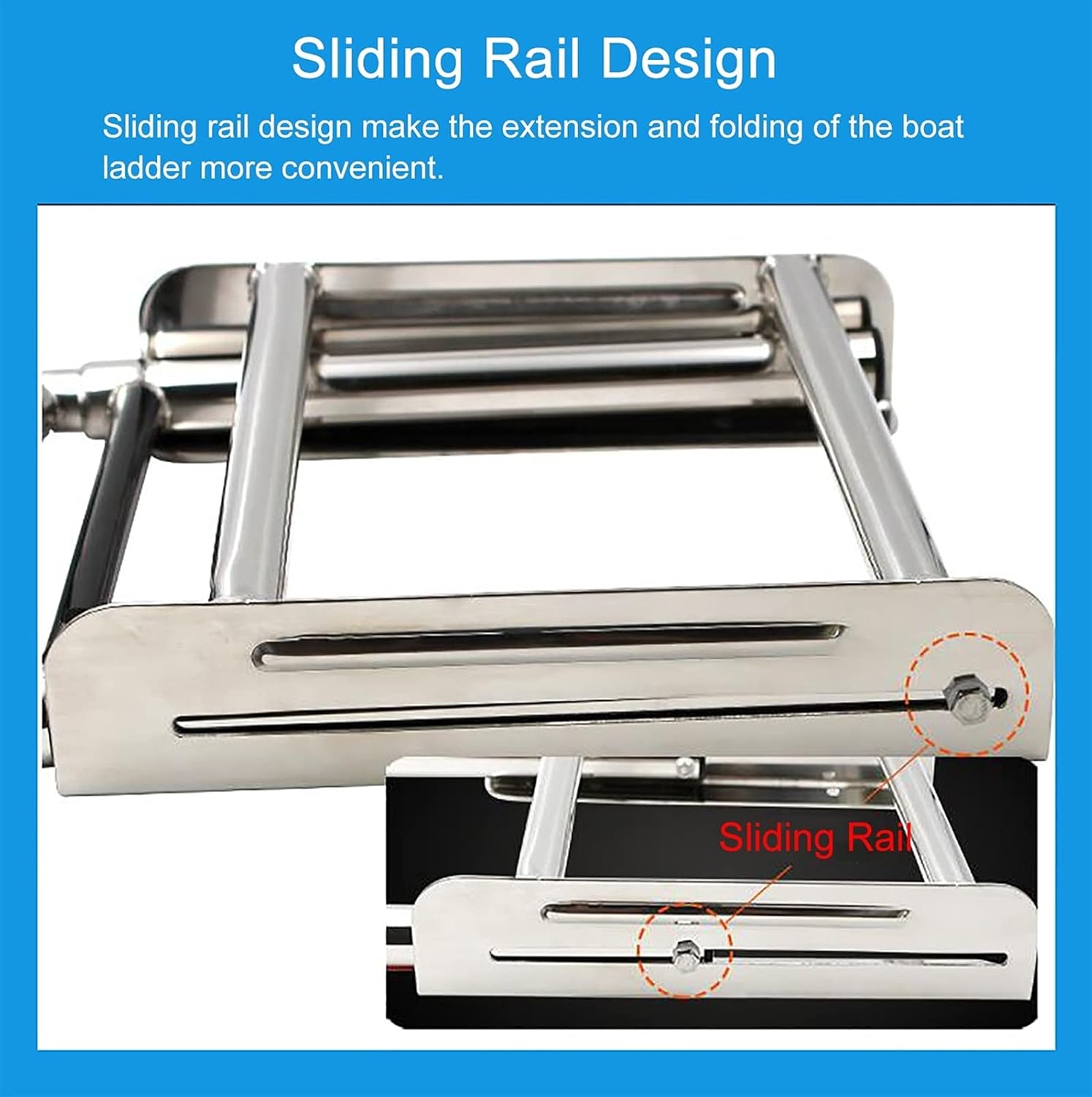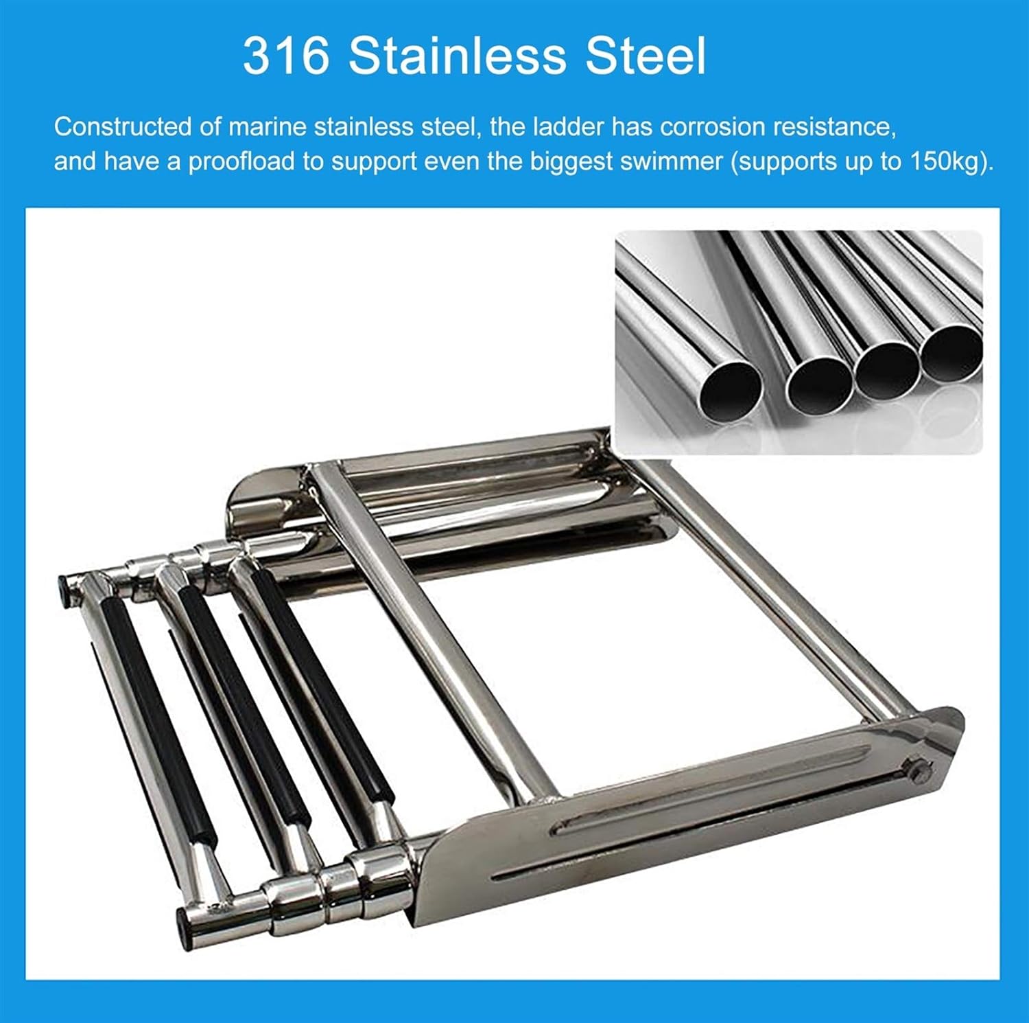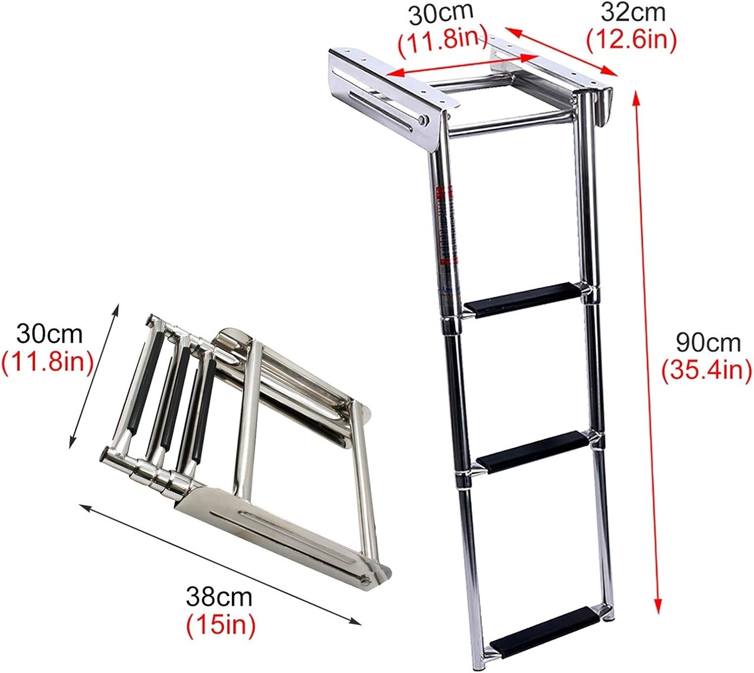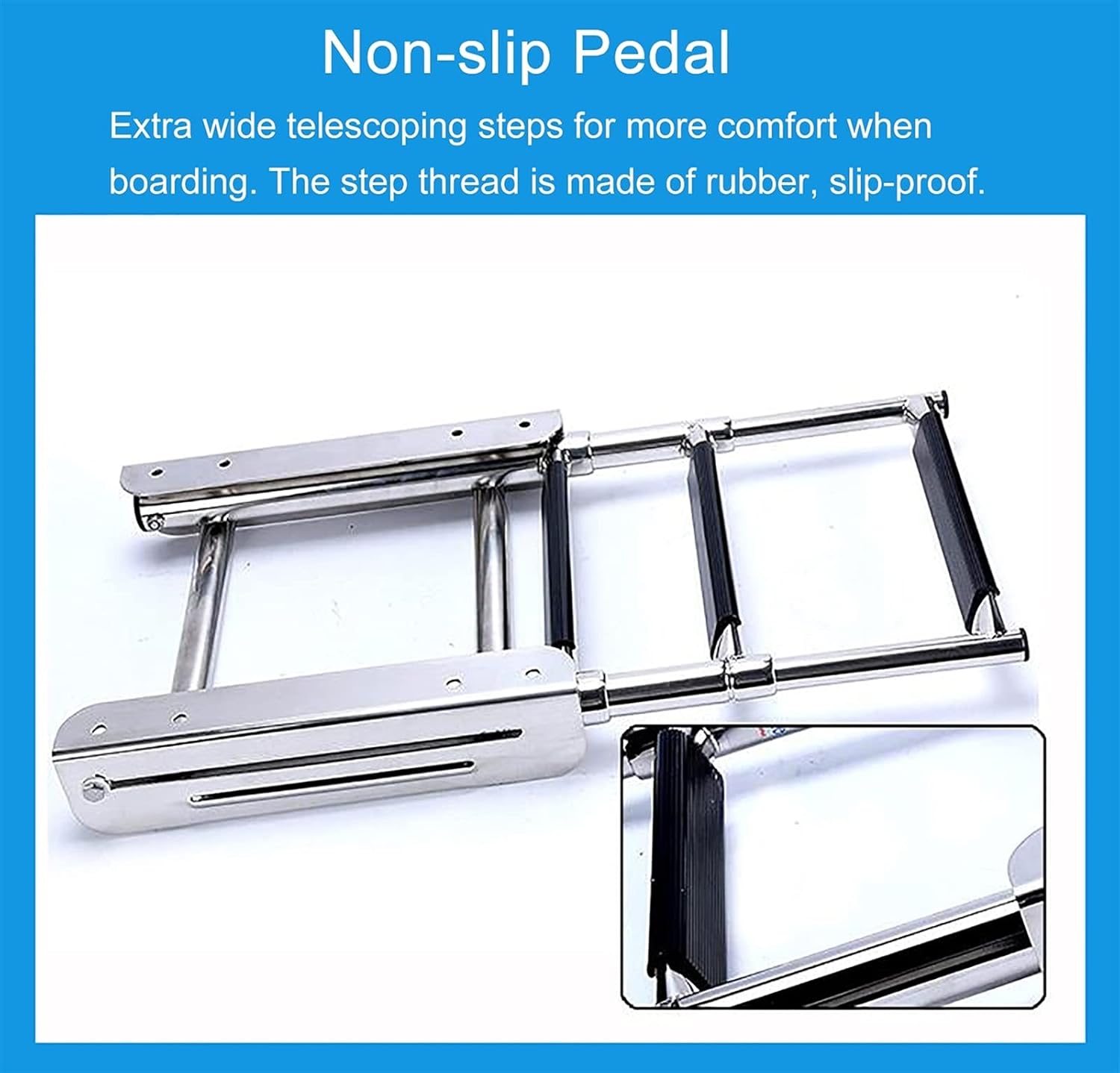 Product DescriptionSleekly designed and manufactured from a high-grade stainless steel, this marine product has been designed to last in the harsh marine conditions. This telescopic boat ladder is made to be bolted to a horizontal platform such a the boat floor or side railings depending on the installation.We are committed to providing customers with quality products, if you have any questions, you can contact our directly, we will provide you with special guidance for 24 hours.SpecificationMaterial: Premium 316 stainless steelSurface Finish: PolishedLadder Length (extended): 3 step: 90cm(35.4in)Length Stowed: 3 step: 38cm(15in)Overall Ladder Width : 30cm(11.8in)Max Load: 150kg/330lbsFeaturesHeavy duty all welded 316 stainless steel pontoon ladder.Wide steps that telescope for a nice clean look.Easily mounts to deck Flips up .The folding steps drop smoothly and quickly into the water to provide convenient boarding.Package Includes1 × Boat Ladder (Installation accessories)NoticePlease allow 1-2cm difference due to manual measurement.The color of the actual items may slightly different from the listing images due to different computer screen.If you have any question or suggestion about our product, please feel free to contact us. Your 100% satisfaction is our pleasure.If you like our products and services check out our store for different sizes and models ladders.