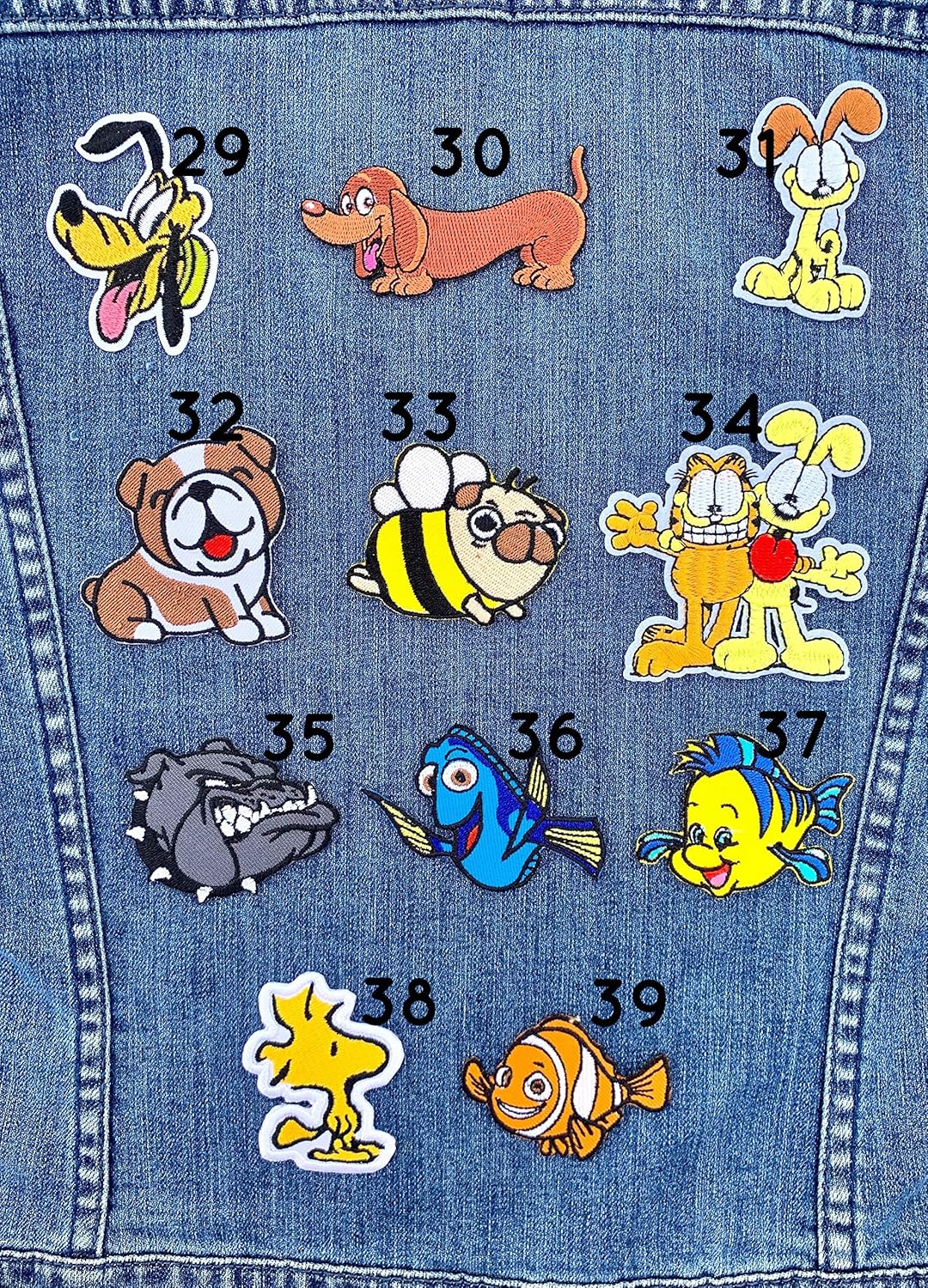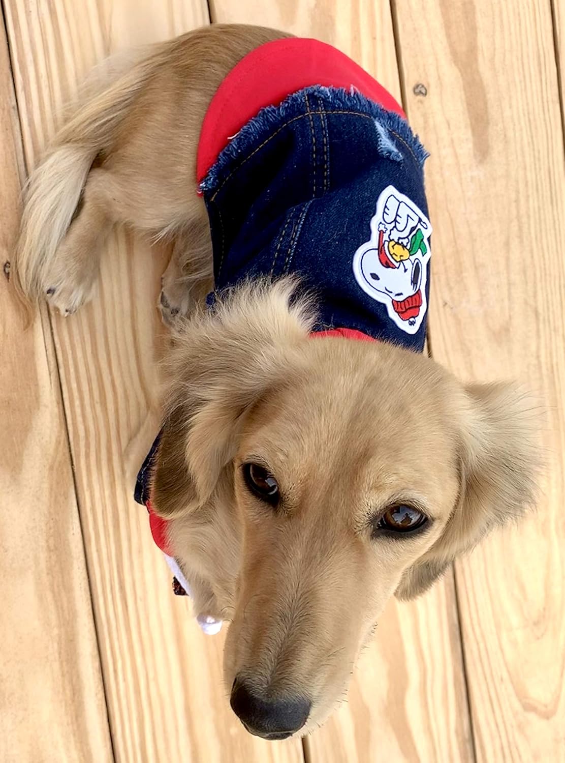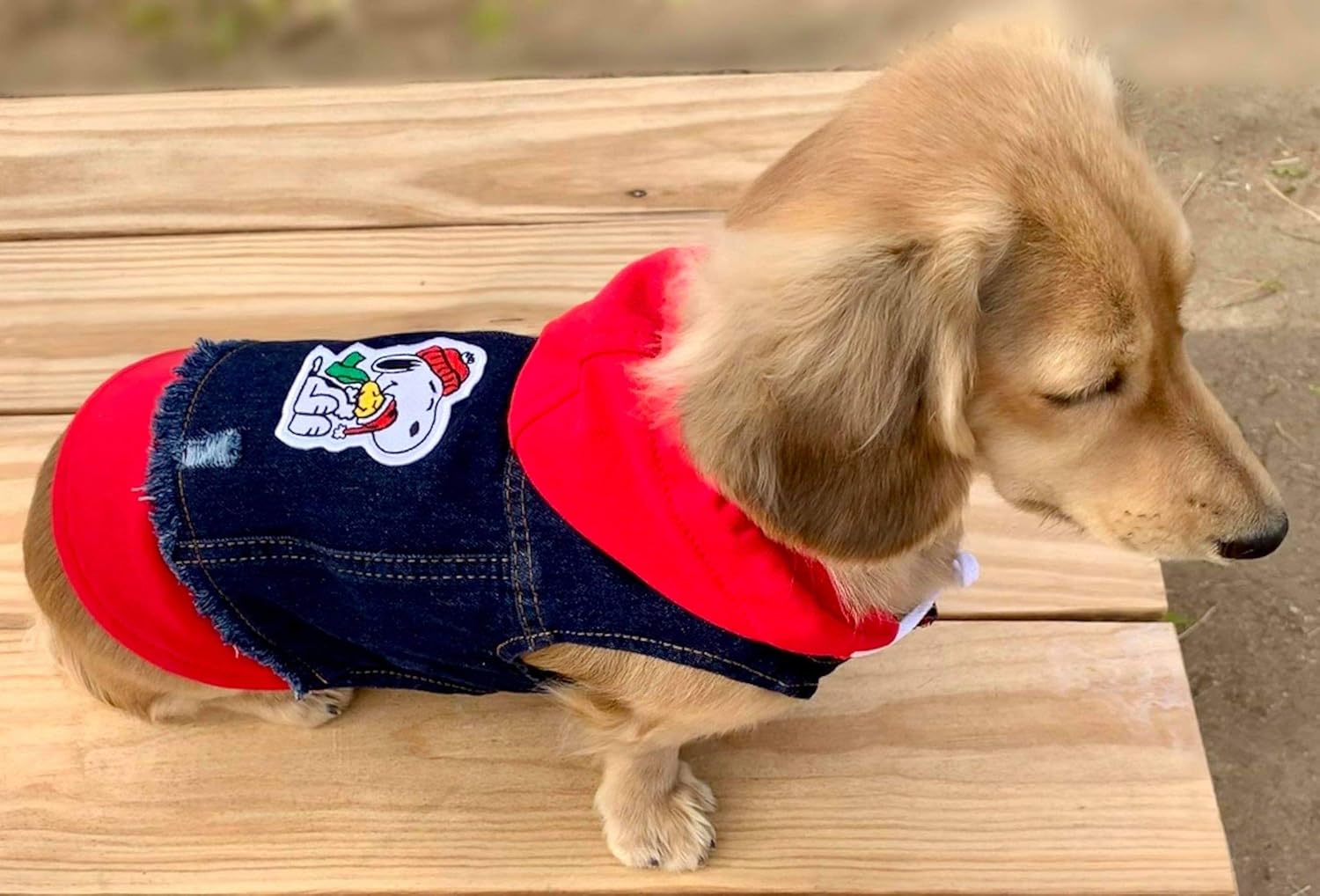 Dress your dog in style with our exclusive PARIS line of clothing. Fashionable Jean Hoodie with custom patch options! Select your patch to customize this adorable jacket Fits all dogs and DACHSHUNDS TOO!! Small, Medium, Large, X Large options. Add Patch Number request at Checkout in NOTE TO SELLER. Jacket modeled by 'Scharlie', our cream long haired dachshund!
