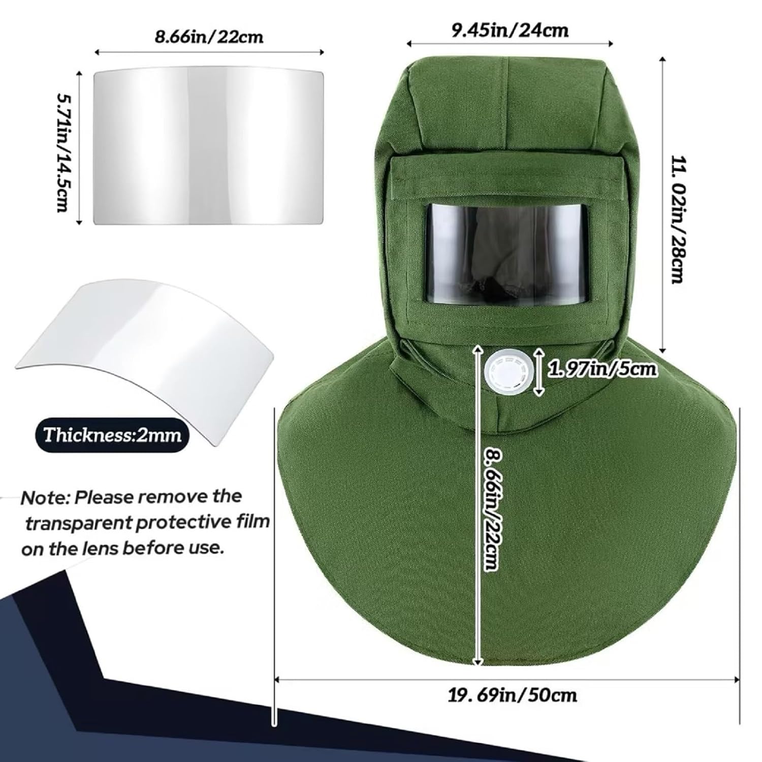 Features: The package includes 1 sand blasting hood which ensures wearer's safety when working, and 10 pieces of replacement lens ensuring the longevity. The green color of this sand blasting hood is a distinct attribute adding to its uniqueness. As for the size, it is displayed in the pictures, ensuring you can accurately assess its fit before purchase. Specifications: Material: canvas, PC Color: green Size: Hood: 19.69 x 19.69 inches/ 50 x 50 cm Lens: 8.66 x 5.71 inches/ 22 x 14.5 cm Package includes: 1 x Sand blasting hood 10 x Replacement lens Notes: Manual measurement, please allow slight errors on size. The color may exist a slight difference due to different screen displays