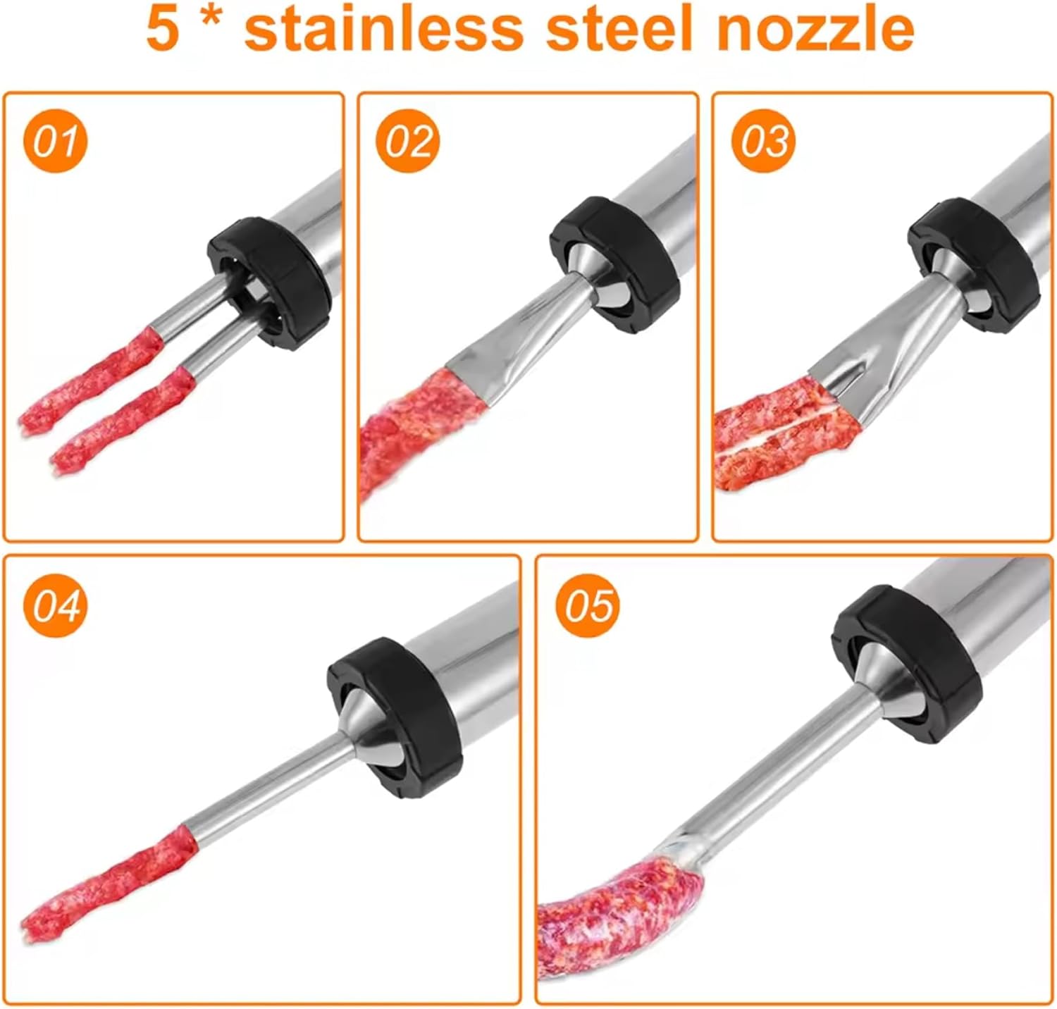 Description: This stainless steel jerky gun kit provides a rust-resistant tool designed for home cooks and meal preppers who want to create high-quality beef jerky, sausage, and other ground meat snacks with ease. Equipped with multiple nozzle sizes, it provides precise control over the shape and thickness of each piece, meeting diverse recipe needs. The ergonomic handle and smooth plunger reduce hand strain, making the stuffing process comfortable for extended use. Included cleaning brushes ensure all parts are thoroughly cleaned and maintained, promoting hygienic food preparation. By enabling consistent portion control and faster production, this jerky gun kit streamlines DIY meat processing, helping users save money while enjoying fresh, flavorful snacks made from their preferred ingredients. Perfectly suited for anyone looking to elevate their homemade jerky and meal prepping routine, this versatile meat gun combines convenience, durability, and functionality without compromising quality. Features:. Jerky Gun. -Color: Silver. -Material: Stainless Steel. Note:Manual measurement, please allow slight errors on size.The colors may exist slight difference due to different screens. Package Including 1 Set Jerky Gun