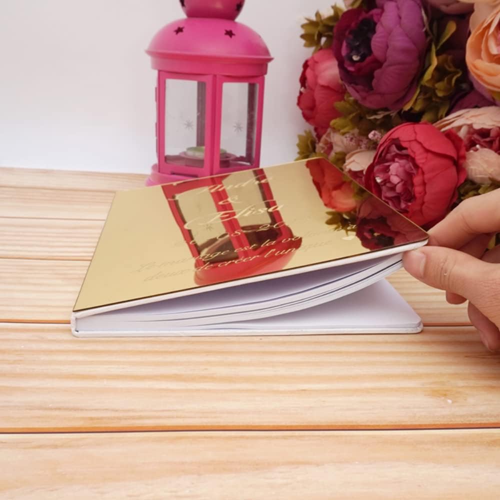 SIZE 1 : 26cm*19cm Use for : Wedding Guestbook cover,Guest book Product : Guestbook,Guestbook cover ,Mirror Guestbook ,Wedding Design Occasion : Wedding & Engagement ,Valentine's Day Color : Gold mirror ,silver Mirror Topic : Party organizer ,Party designer ,event design Use : verlobungstablett Feature 1 : invitation,card ,sweet table ,dream wedding Feature 2 : Without backside mirror ,contact us if you want . Feature 3 : Wedding Book, Check-in book ,Sign this book,name mirror Product Feature : blank pages ,Blank Sheets ,white pages , Quantity of pages : 60 sheets (120 pages)