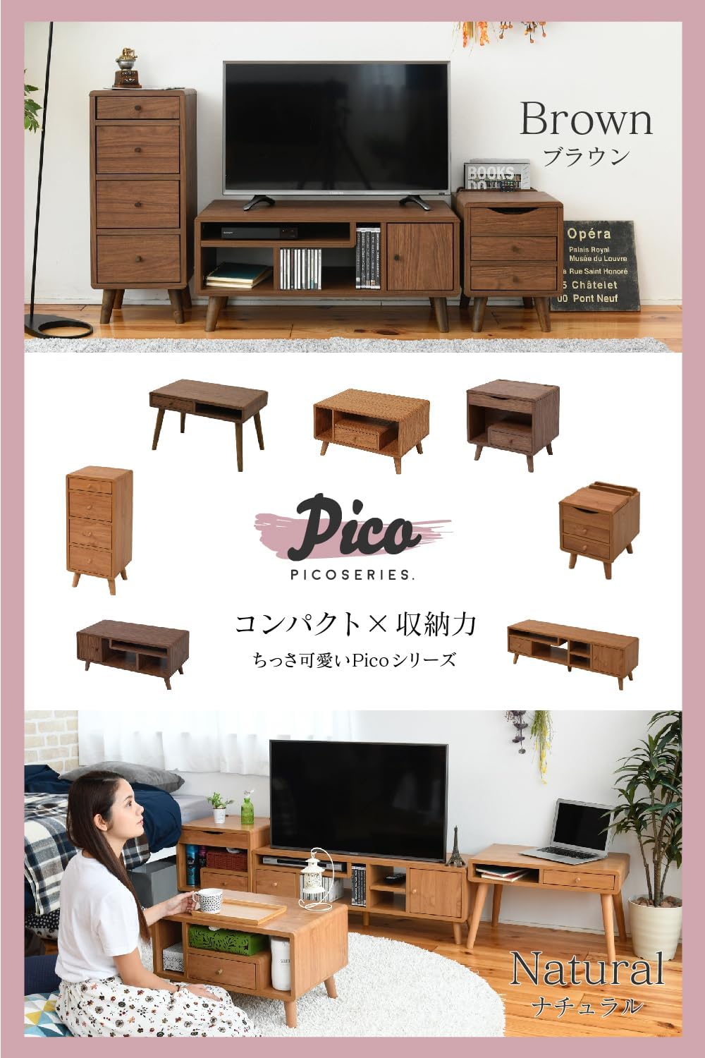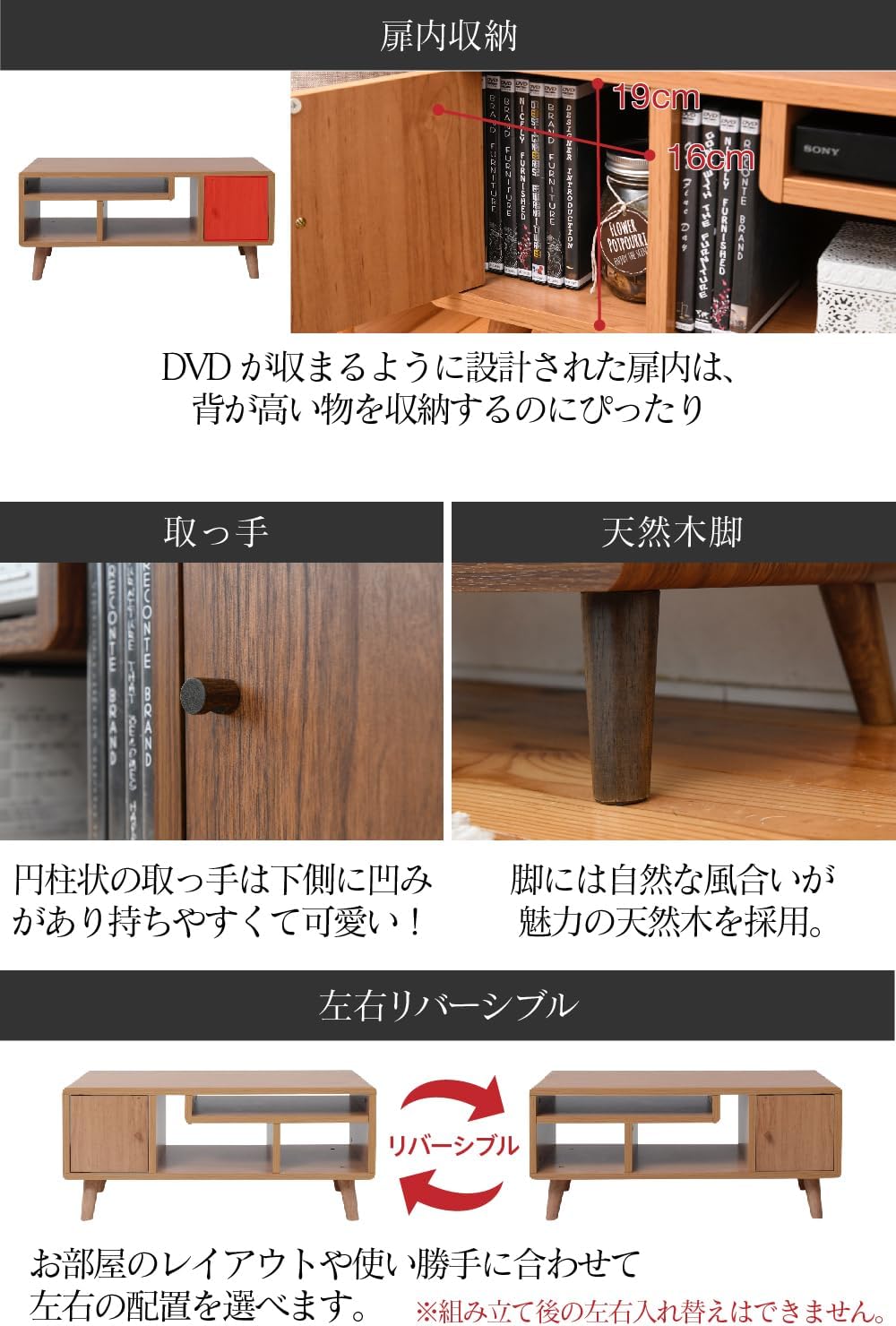 Small but stylish enough to store your TV in style. You can set the door to the left and right as you like. The compact Pico series TV stand is 800 wide. The storage space has been designed to reduce waste based on the number calculated from the shape of the items being stored, so it can also be stored neatly from CDs and DVDs, as well as hard computers such as DVDs, Blu-ray recorders, and other gaming consoles. The legs and seat are also Scandinavian style, making it very stylish.
