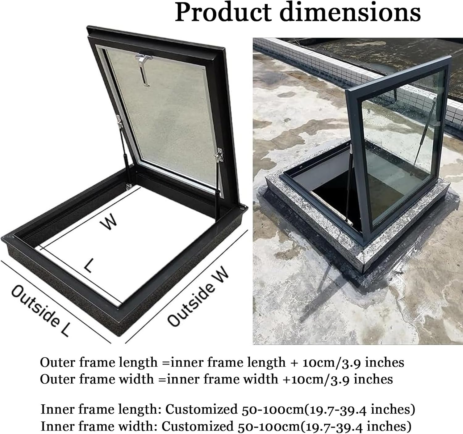 JKGHK hand skylight features a user-friendly manual opening mechanism, allowing effortless airflow control for improved indoor ventilation and comfort in any season.Not only can be used as attic sliding window, escape hatches, basement exits, emergency access points, wellheads, cellars, and manholes, it can also be used for home improvement, industrial, commercial, school, etc.Product name: Manual sunroof/Egress Roof Window/Sloped Flat Roof Skylight Cover/Attic Sun Room Roof Window/Underground Lighting Well Window/ Roof Steel Security Door/ Roof right to use HatchMaterial: Aluminum Frame + Tempered GlassTempered Glass: 5MM ThickWindow opening : Outward openingInstallation: Embedded installationMeasurement size: Based internal dimensionsDimensions: Width x HeightPackage Content:- 1 × Roof Hatch- All Necessary Screws(The rest need to be purchased separately)Notice:1.Please wear gloves when installing to avoid scratching.2.This product is manually measured, there may be an error of 0 ~ 1 cm ( 0 ~ 3/8" ).3.Due to the light and screen setting difference, the item's color may be slightly different from the pictures.