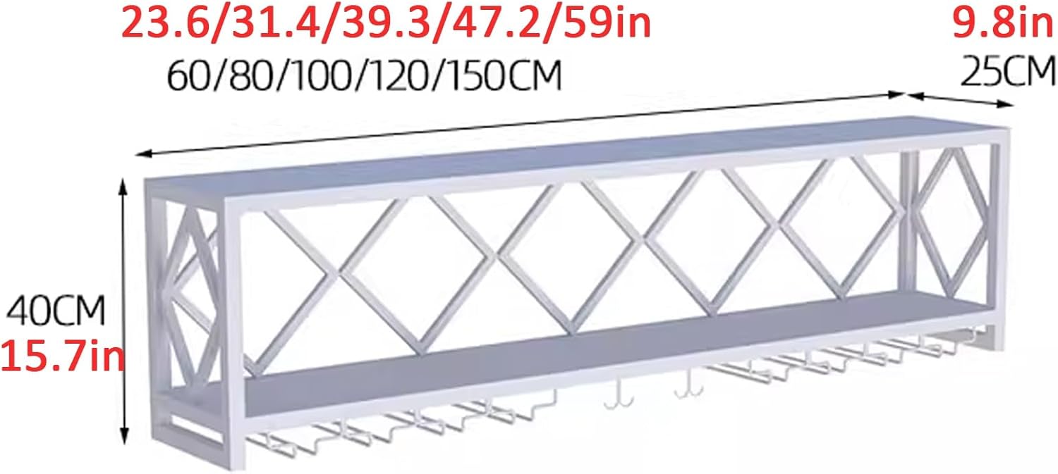 Glass Holder is preferably made of thickened pipes, with a firm structural frame, strong stability and better load-bearing capacity.A variety of storage, free up space, say goodbye to disorder and clutter.JKGHK wine Holder is preferably made of iron precision welding, with a stable and firm structural frame, strong stability and better load-bearing capacity.Pure points, lines and surfaces constitute every bit of life, creative space partition, fashionable and beautiful.Name: Wine glass holderMaterial: IronColor: Black , Gold , WhiteStyle: Minimalist modernPlacement: Wall-mountedFurniture Structure: Frame structureSurface Technology: Baking paintDimensions: 60/80/100/120/150×45×25cm / 23.6/31.4/39.3/47.2/59×17.7×9.8inInstallation or not: YesUsage: Ideal for Living Room, Bedroom, Hotel, Restaurant, Bar, CafePackage Includes:- 1x wine rack- 1x screw setPlease Note:1.Only wine holder is included, other items shown are not part of the package.2.Due to lighting and monitor differences, colors may vary slightly from the images.3.Permissible measurement error: +/- 1-3cm.