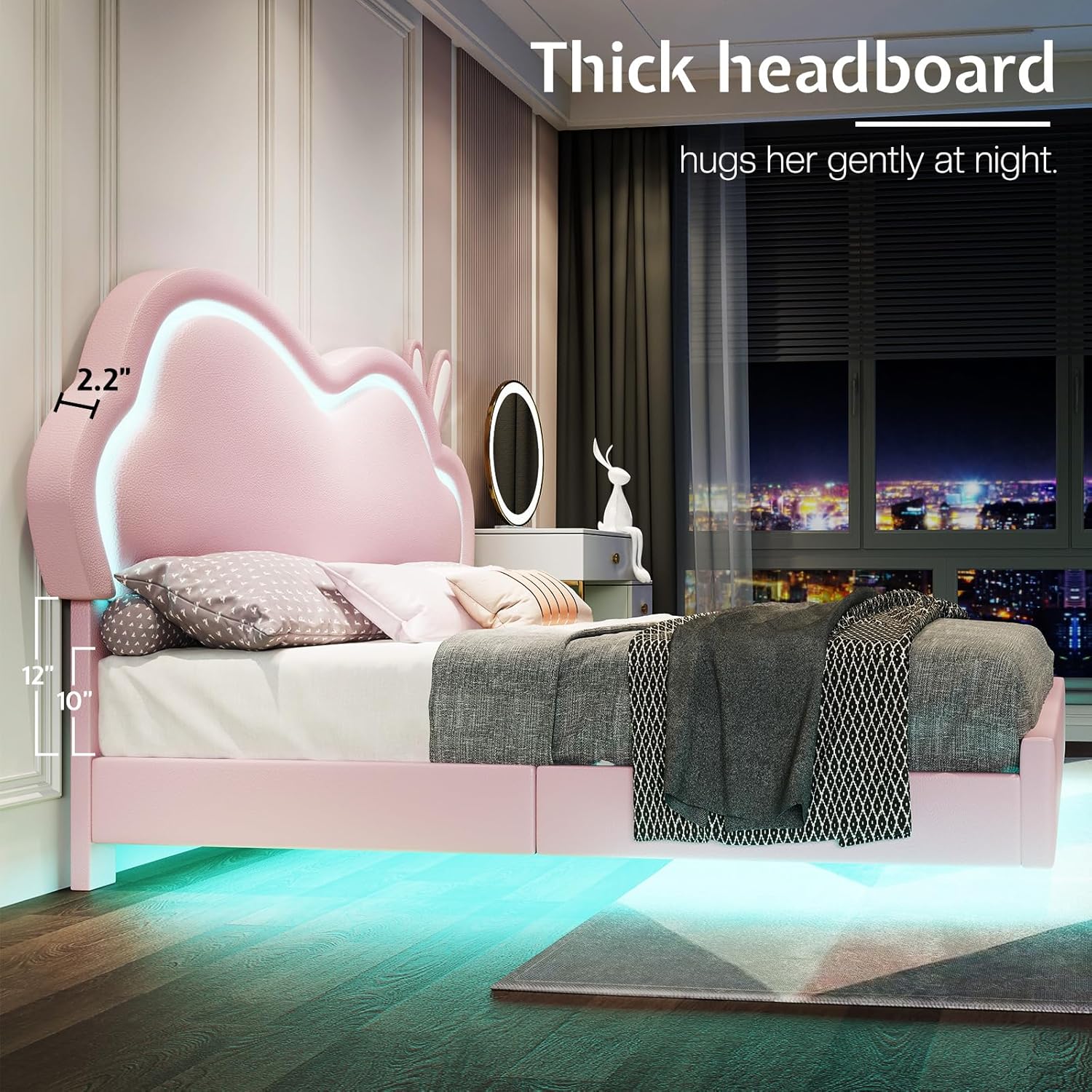 | Additional Features | Adjustable Height, Cloud-Shaped Headboard, Floating, LED Lights, Upholstered |