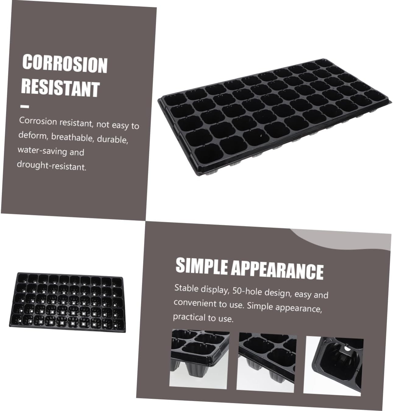 Package List 10 x Germination Trays Characteristics -Material: PP. -Product Info:Seedling tray -Size: About 54.00X28.00X5.00cm/21.22X11.00X1.97inch. -Color: Black. - , you can buy this delicate and practical plant starter plate at an Greenhouse Planting Tray. - 50-holes allow you to types of plants in one tray and fix the pellet in place without failing growing trays. - Allowing your small plants, vegetables and flower to germinate in a warm environment planter starter trays. - plastic material, strong and durable, not easy to deformation. - This nursery plate is very suitable for home gardening nursery and novice use garden tray.Goods Informationstarter trays One box has 50 individual holes, very convenient.garden planting tray It is especially great for growing small crops of like as sprouts, grass, , etc.Germination Plates Made of durable plastic material, this nursery plant tray is lightweight and wear resistant